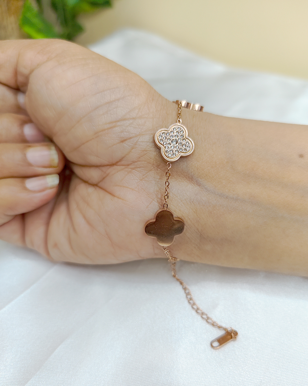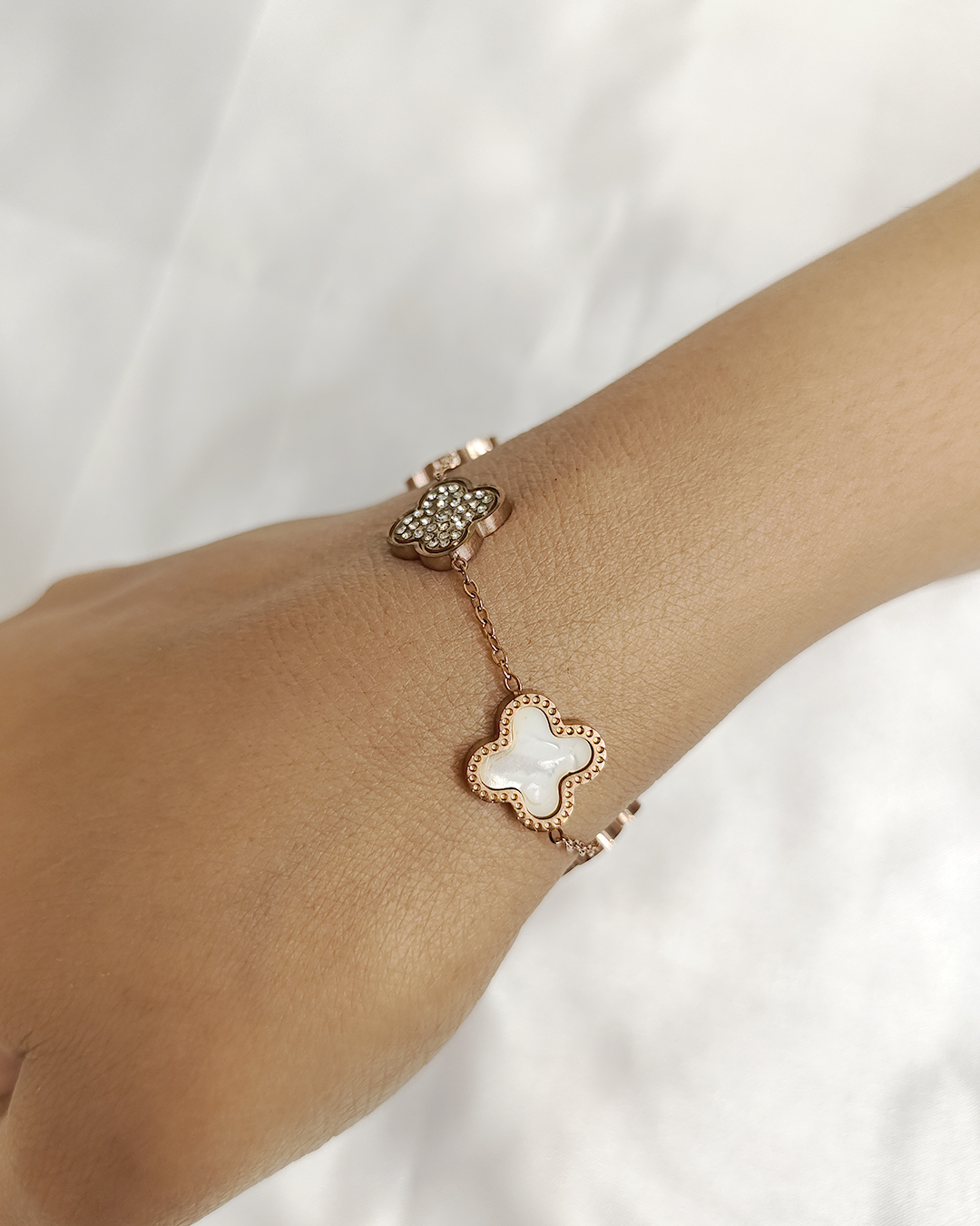 Chain: The motifs are connected by a delicate rose gold or gold chain, which is dainty and elegant.
