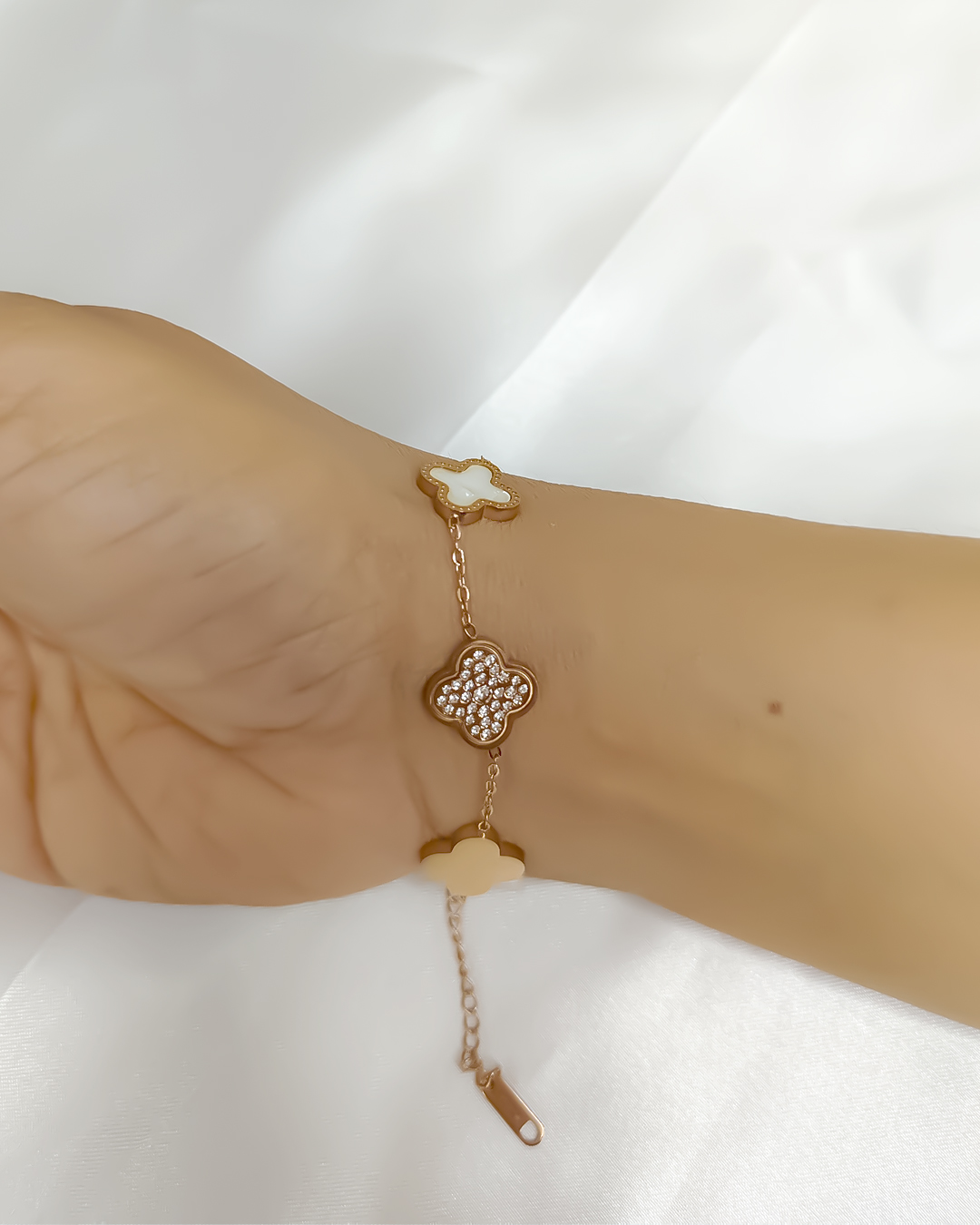 The bracelet features the famous clover-shaped motifs, which resemble a four-leaf clover or quatrefoil pattern.