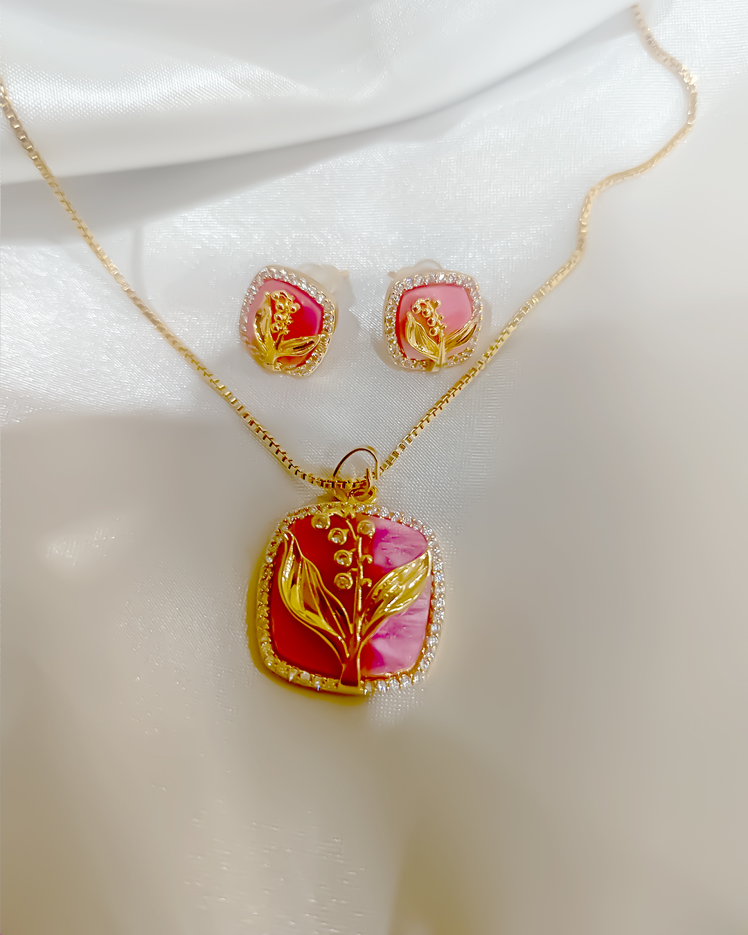 This handcrafted pendant set features a stunning red and gold floral enamel design with matching earrings, perfect for both traditional and modern outfits.