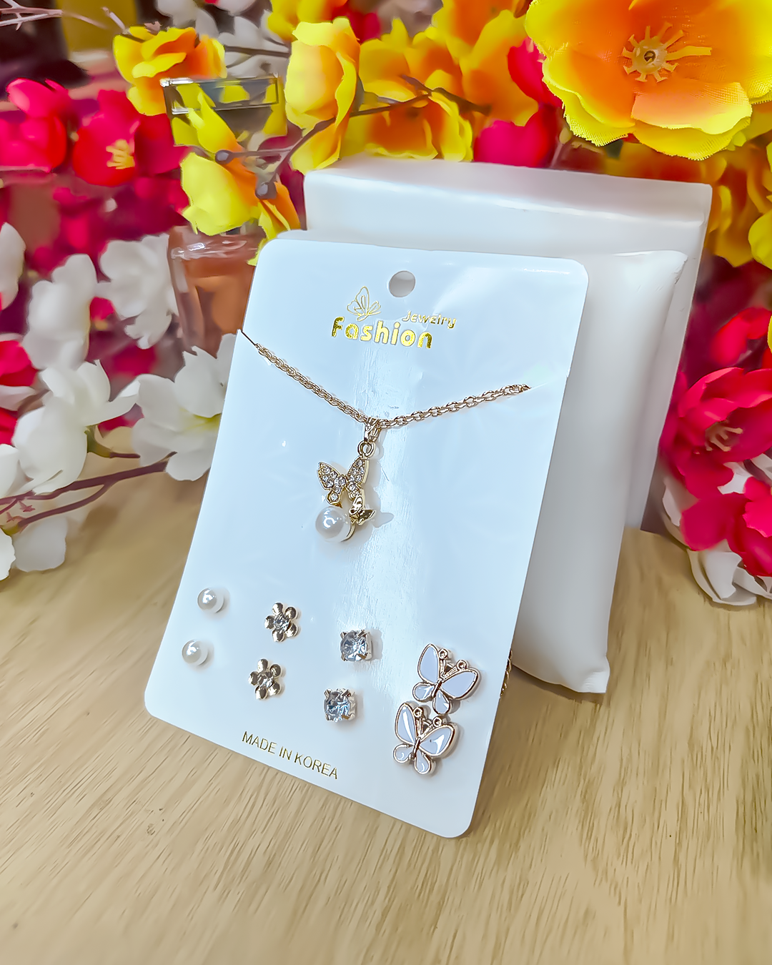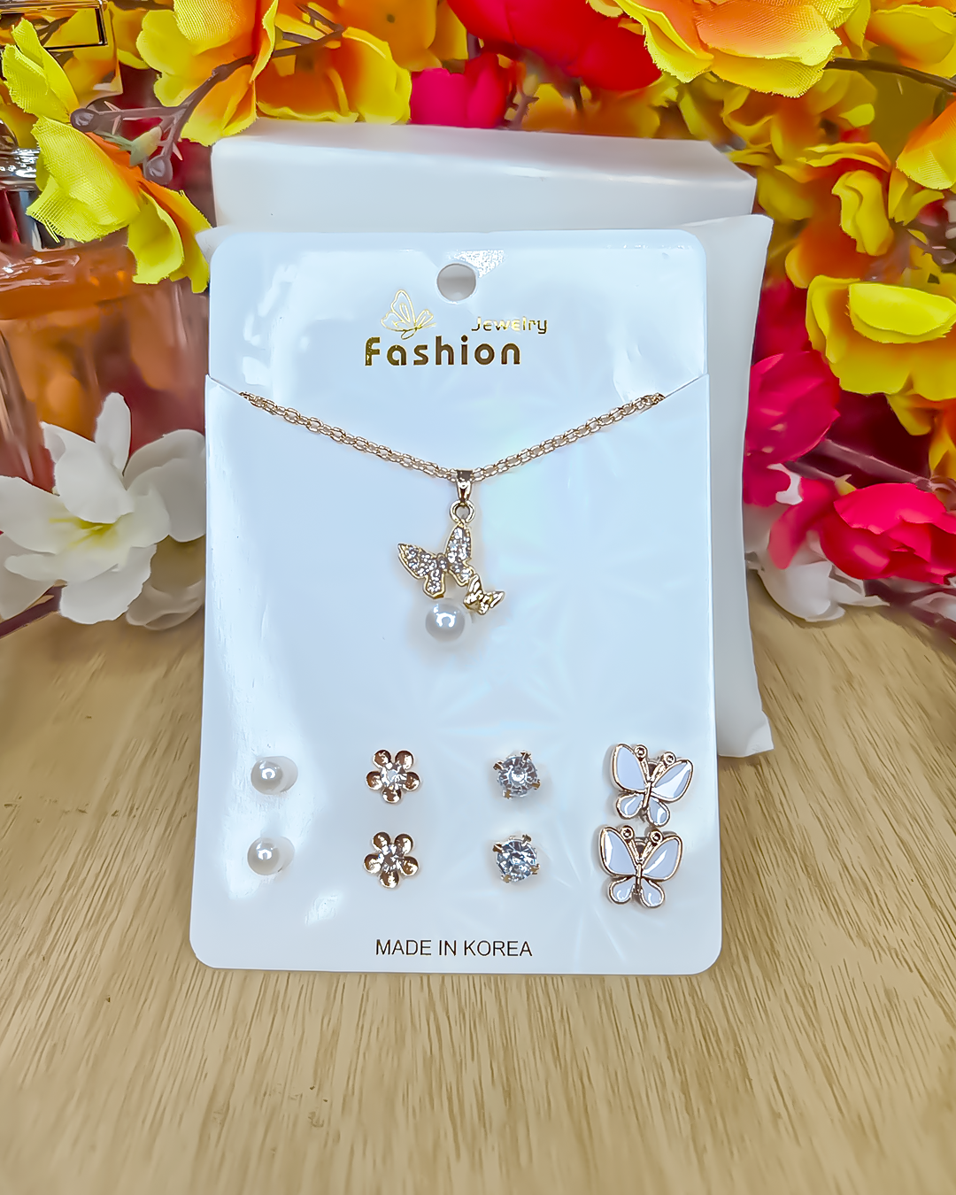Elegant jewelry set featuring a delicate pendant necklace with matching stud earrings, designed with floral and butterfly-inspired motifs for a graceful and feminine touch.
