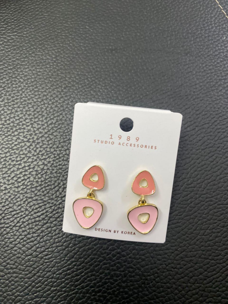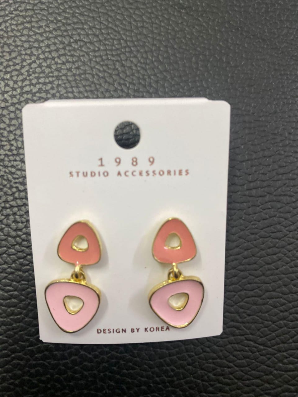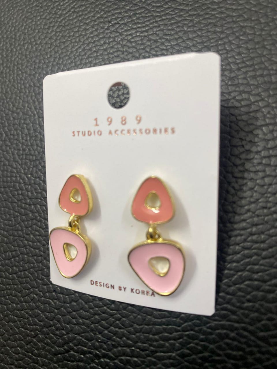 Trendy blush pink geometric drop earrings with a chic gold-tone outline, perfect for adding a playful yet elegant touch to your look.