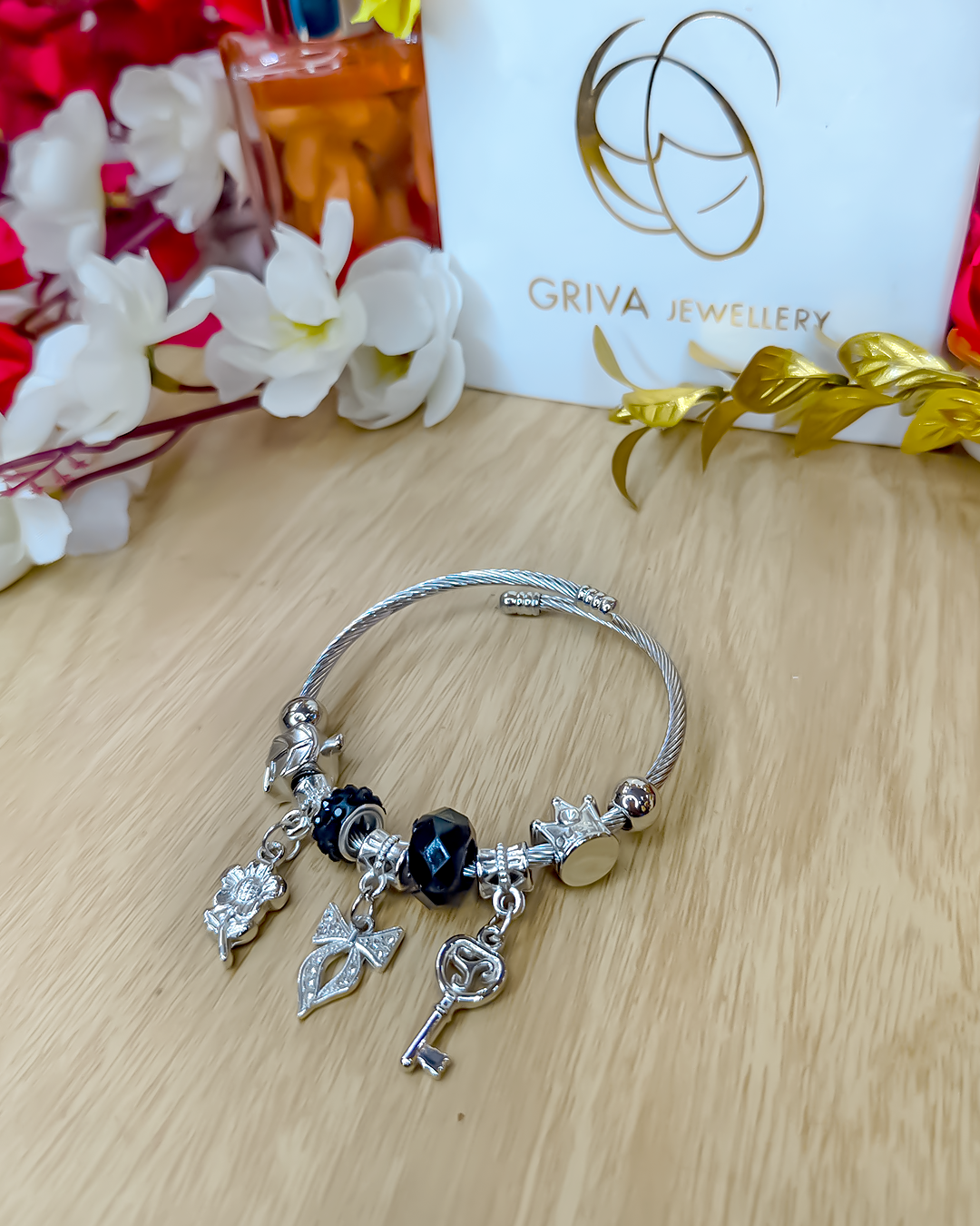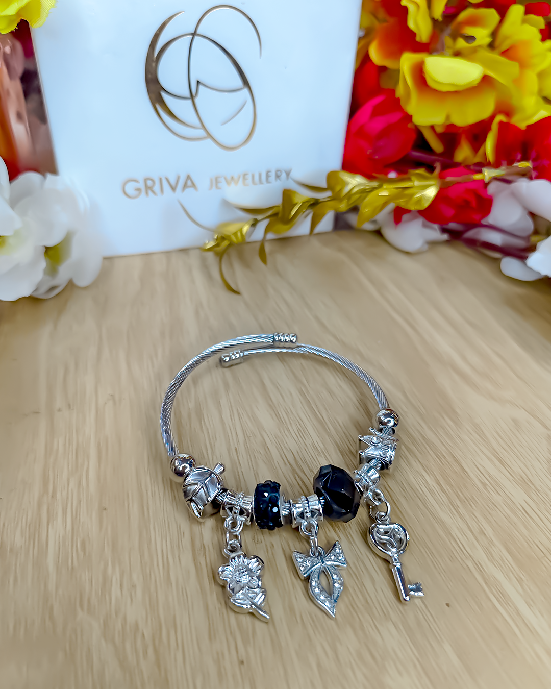 Elevate your everyday look with the Celestial Charm Bracelet, a graceful silver-toned bangle adorned with black and silver beads and whimsical hanging charms. Inspired by cosmic elegance, this piece adds a playful yet classy touch to any outfit.