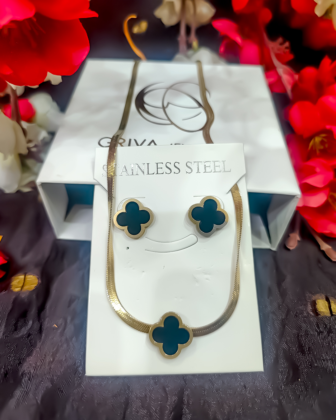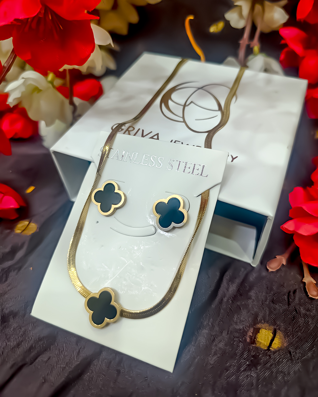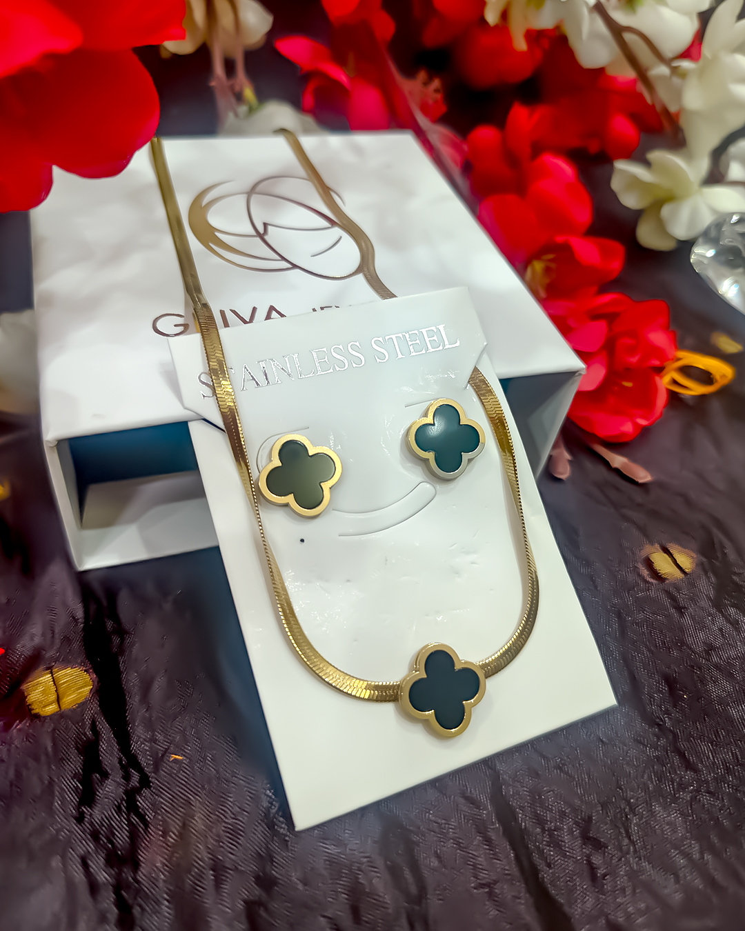This stylish pendant and earring set features a modern clover motif in deep emerald black, offering a blend of elegance and everyday charm. Perfect for adding a pop of color to your look.