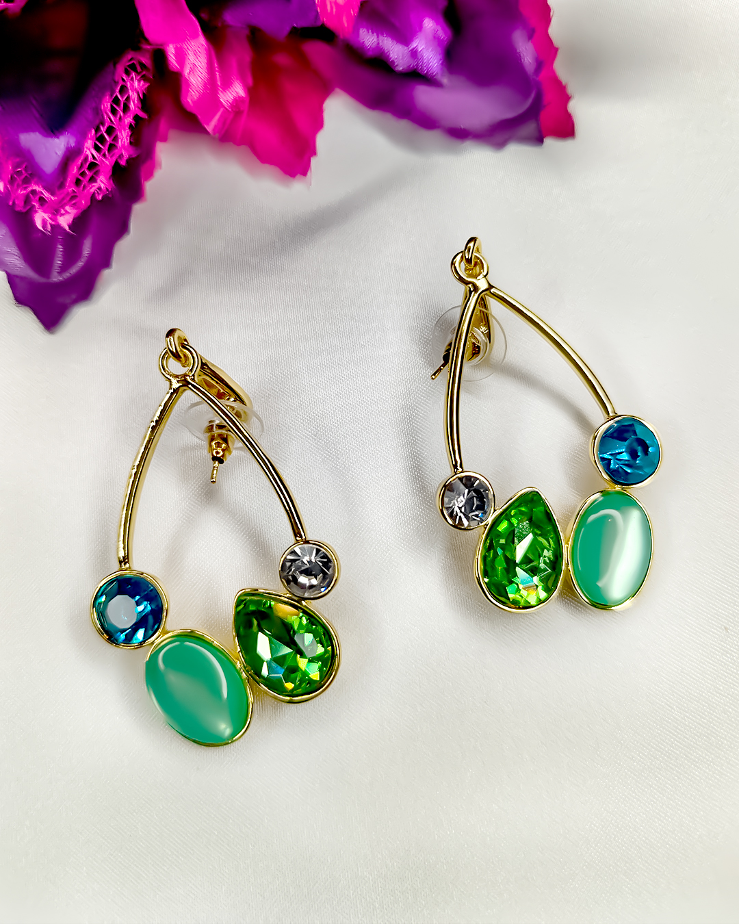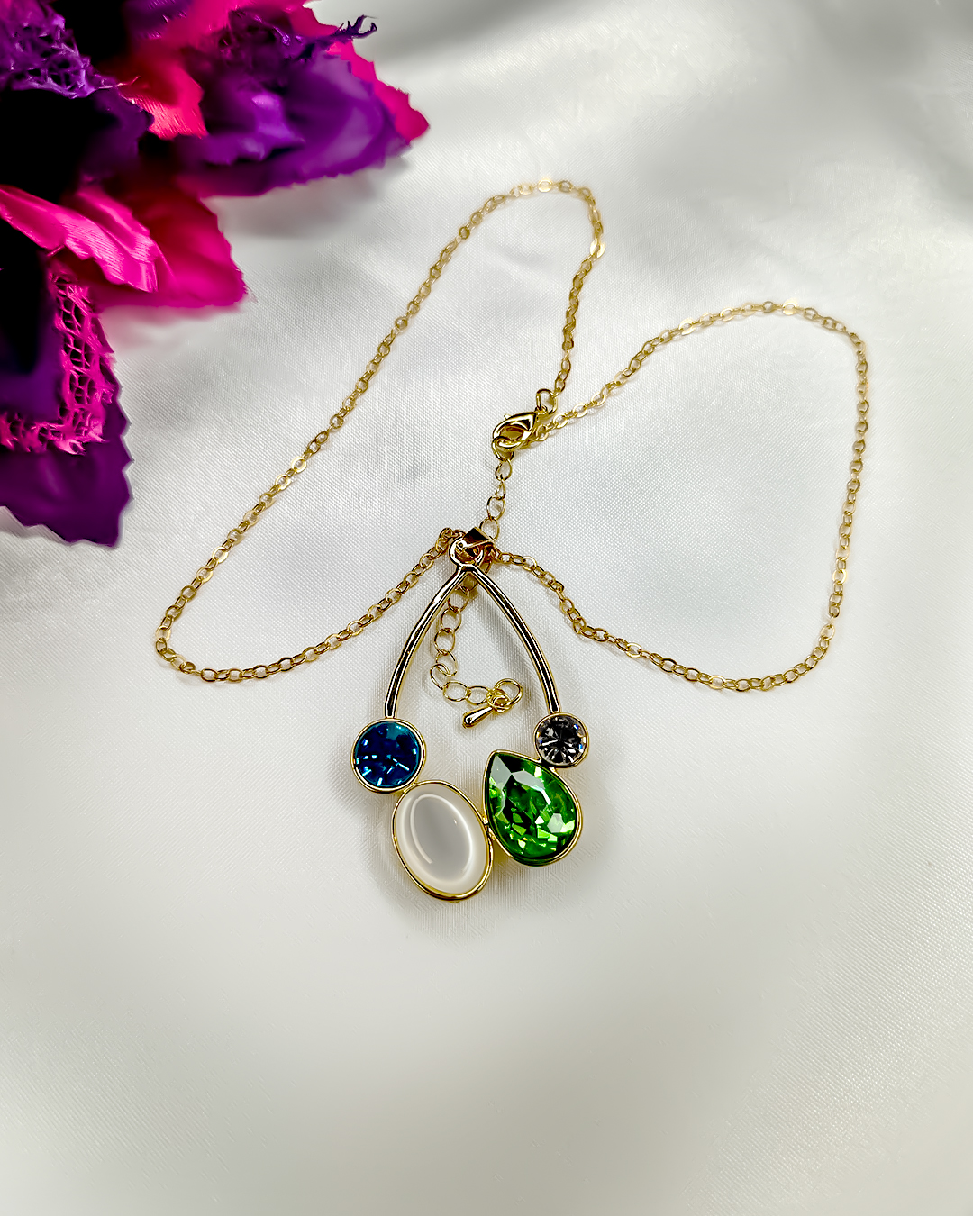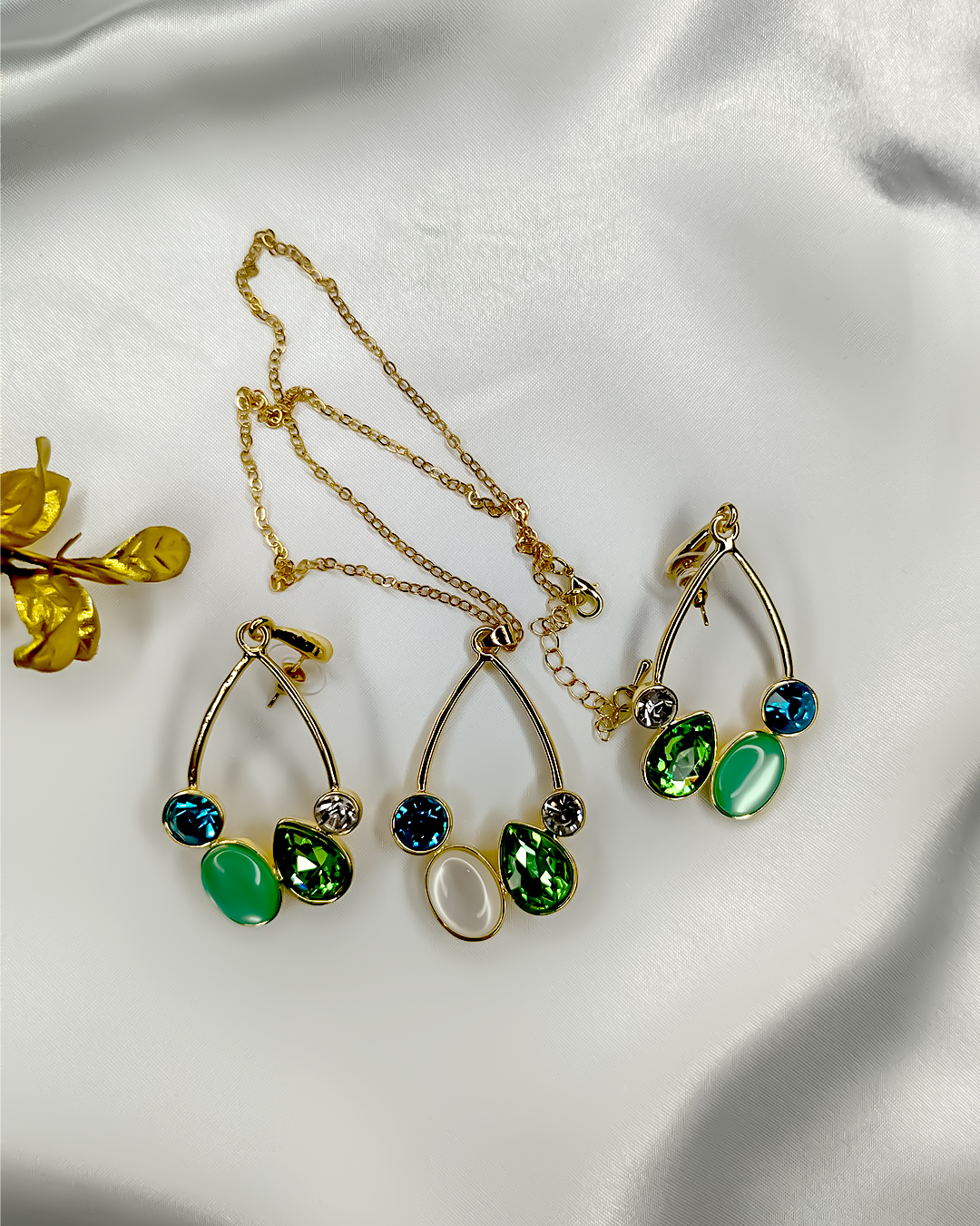 Elegant multicolor pendant set featuring a contemporary design with vibrant blue, green, and clear stones set in a gold-tone frame. Perfect for both casual and festive wear.