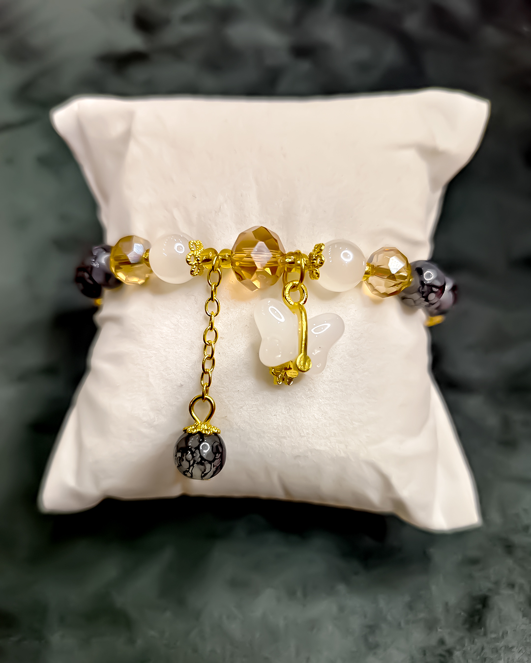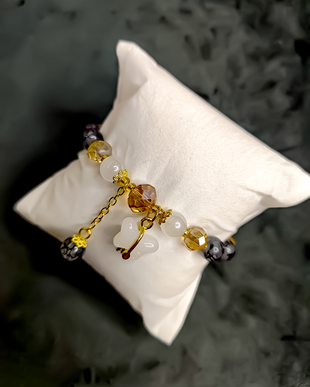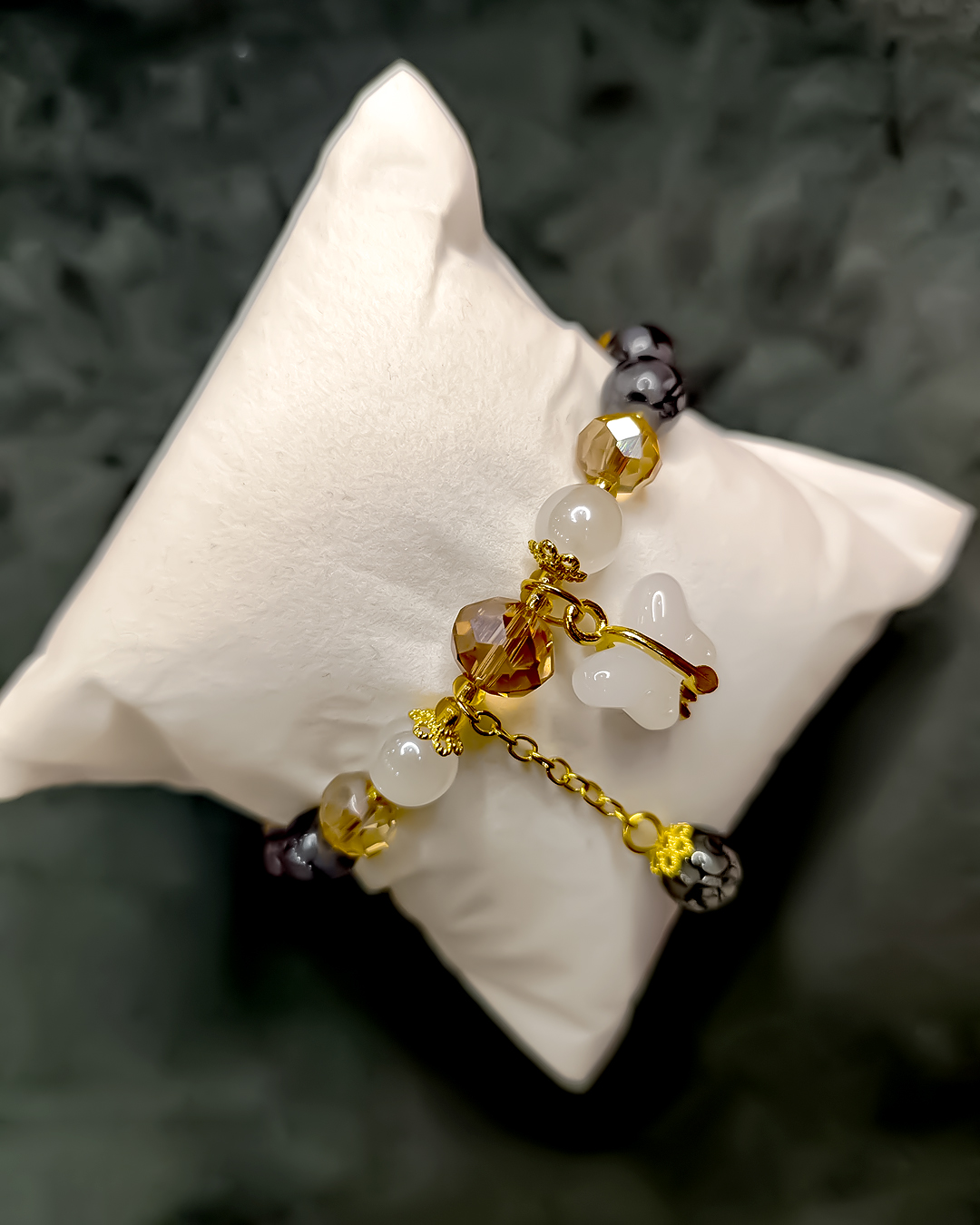 The bracelet features a delicate chain adorned with golden accents and lustrous decorative beads in purple and white tones.