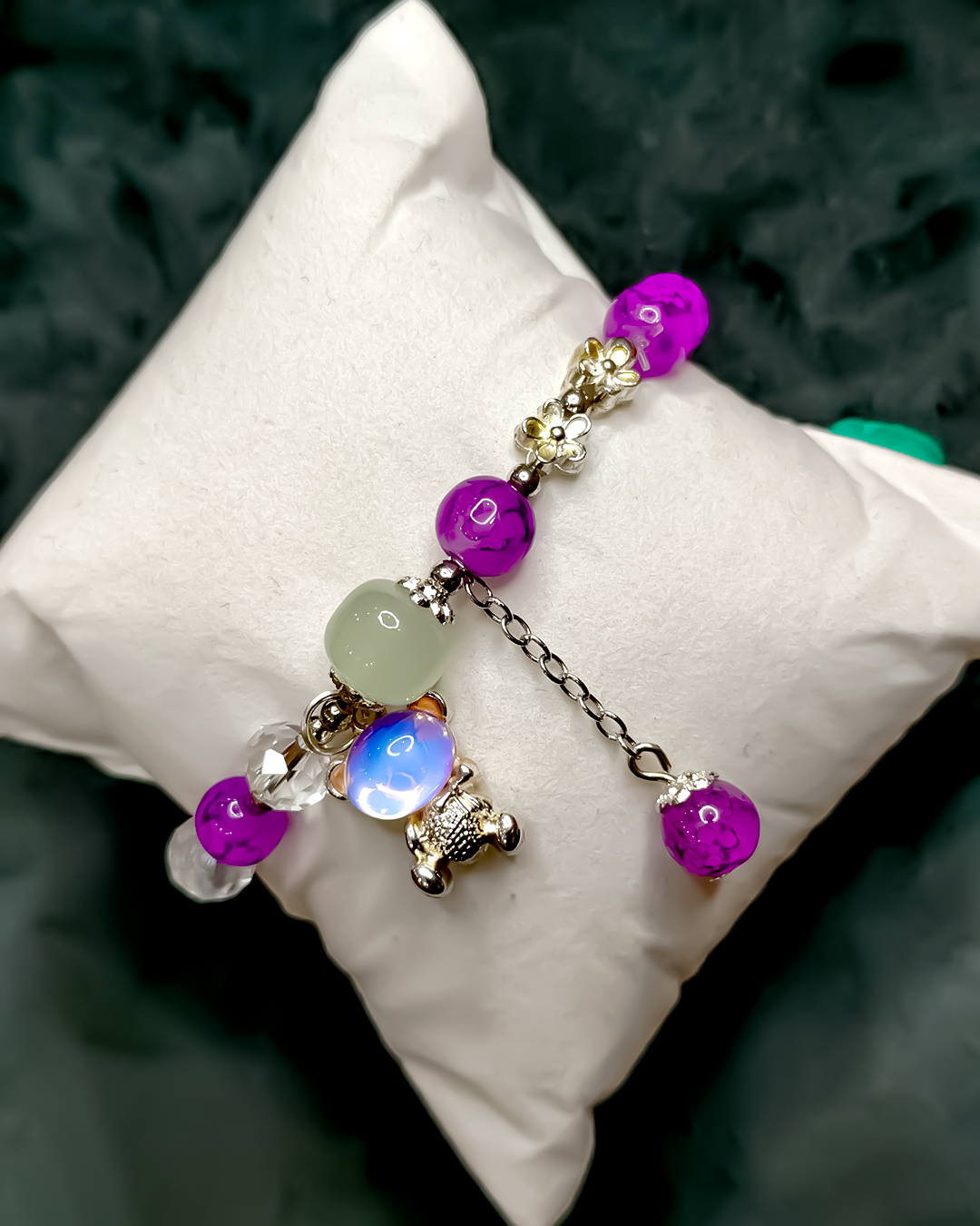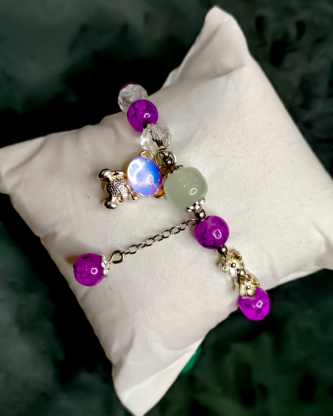 The bracelet features a delicate chain adorned with silver accents and lustrous decorative beads in purple and white tones.