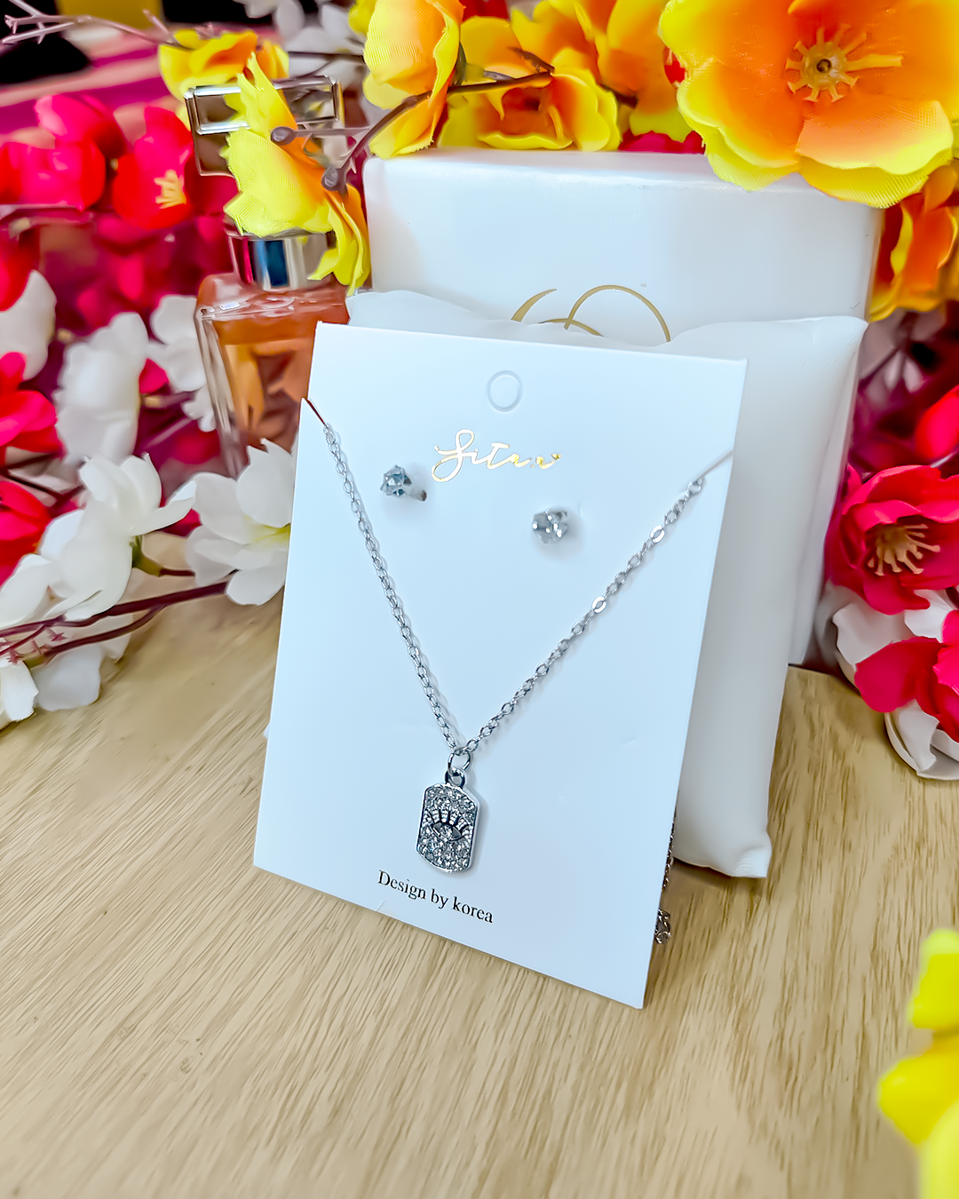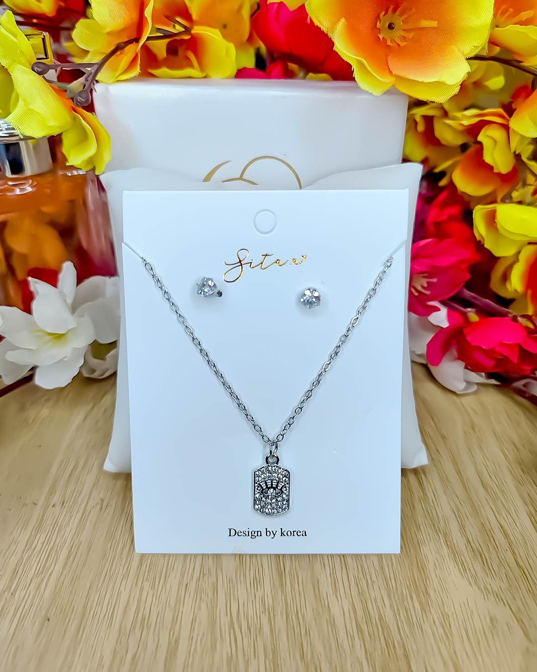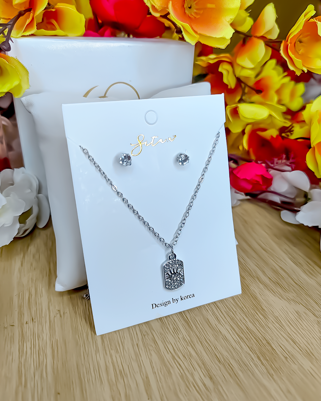 A stunning silver-toned pendant and stud earring set, featuring a brilliant square-cut cubic zirconia stone that catches the light with every movement. Perfect for adding a touch of sophisticated sparkle to any outfit.