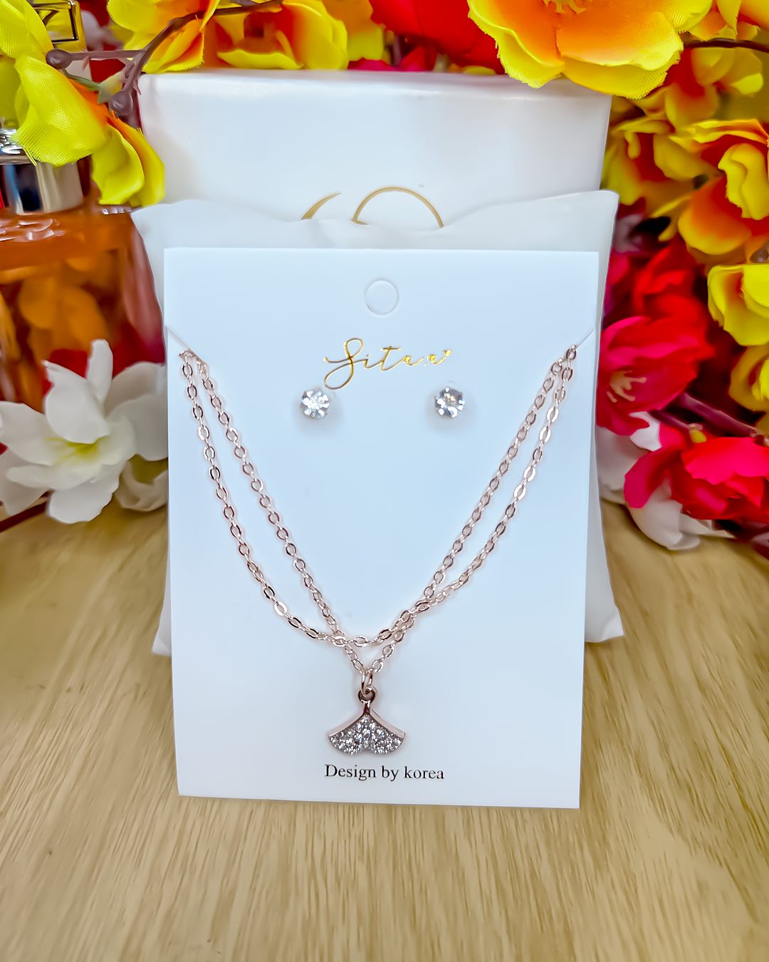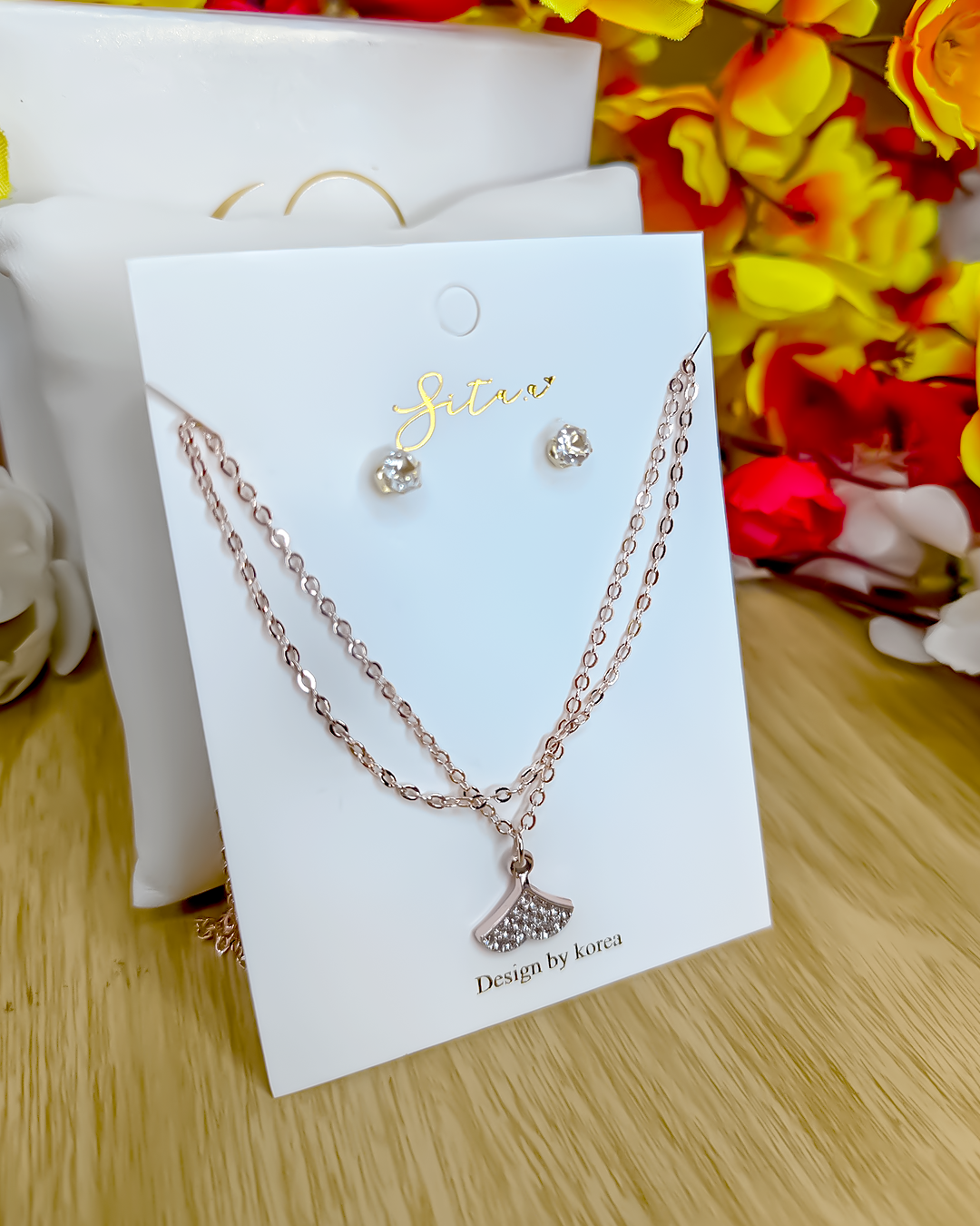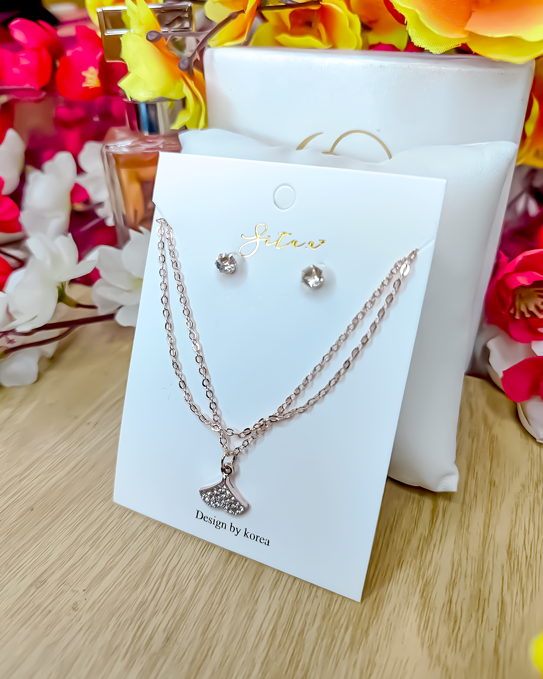 A delicate and elegant silver-colored jewelry set featuring a necklace with a shimmering pendant and a pair of matching stud earrings, perfect for everyday wear or special occasions.