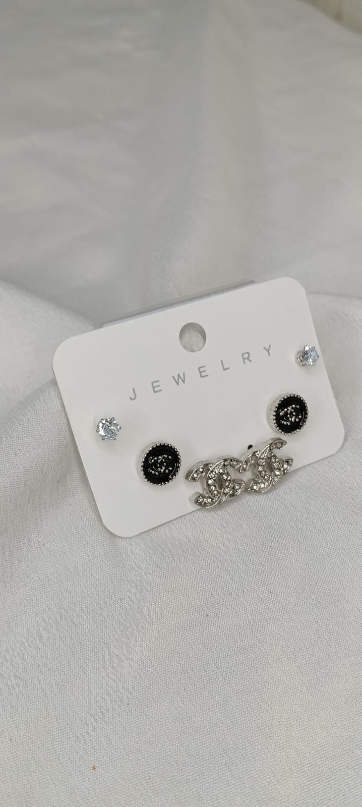 A versatile 3-pair stud earring set featuring sparkling crystal studs, vintage-style black embossed studs, and a silver-toned embellished motif pair. Perfect for matching with different outfits, from daily wear to elegant looks.