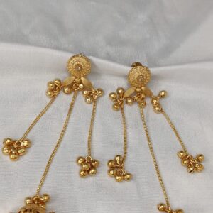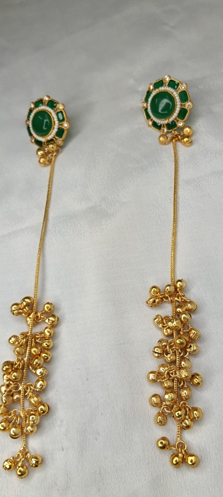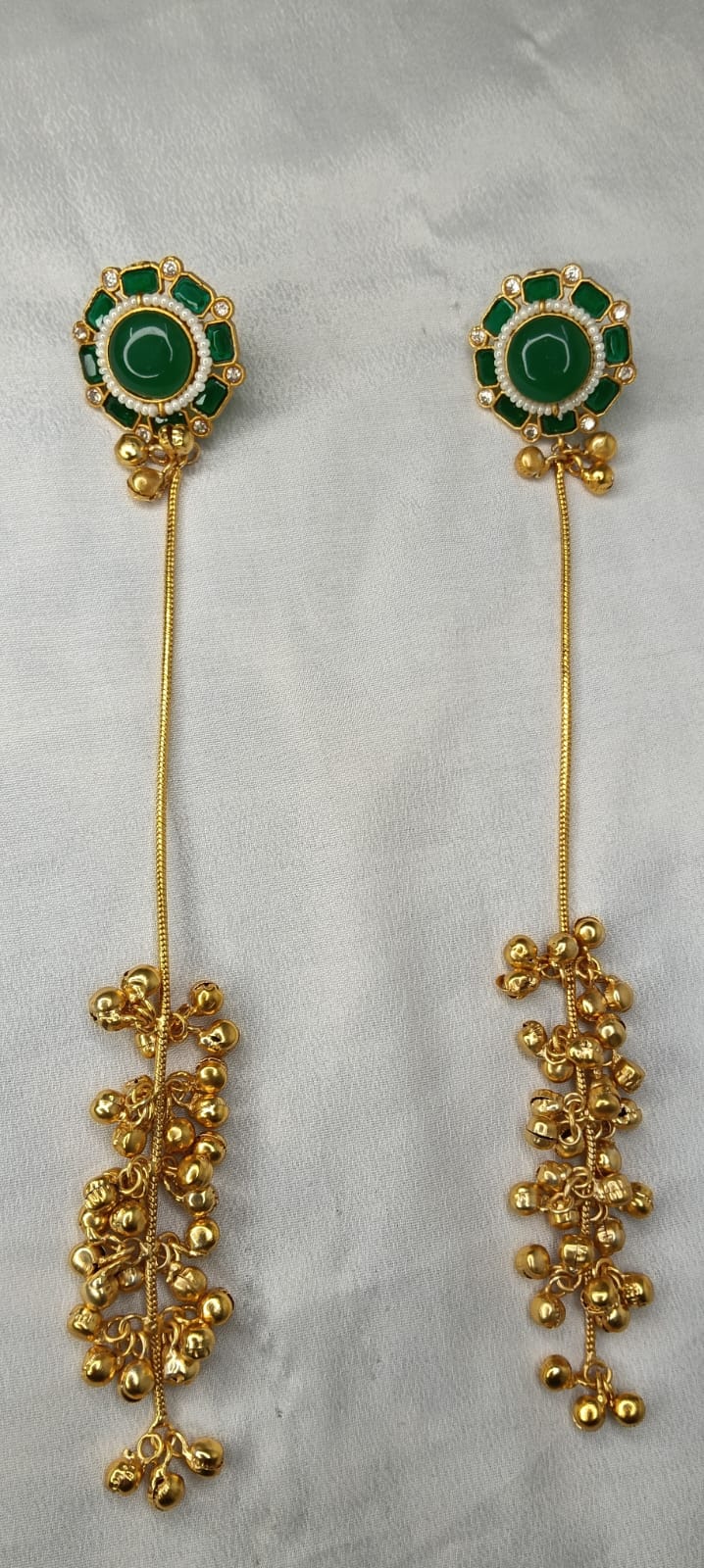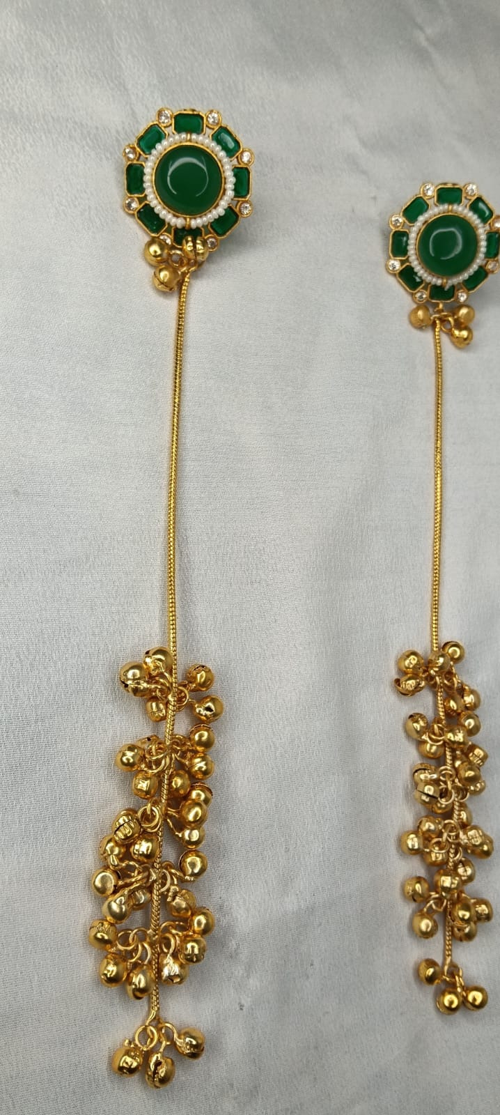 This traditional earcuff showcases a deep green centerpiece framed by pearls and extended with delicate ghungroo drops, adding movement and royal charm.