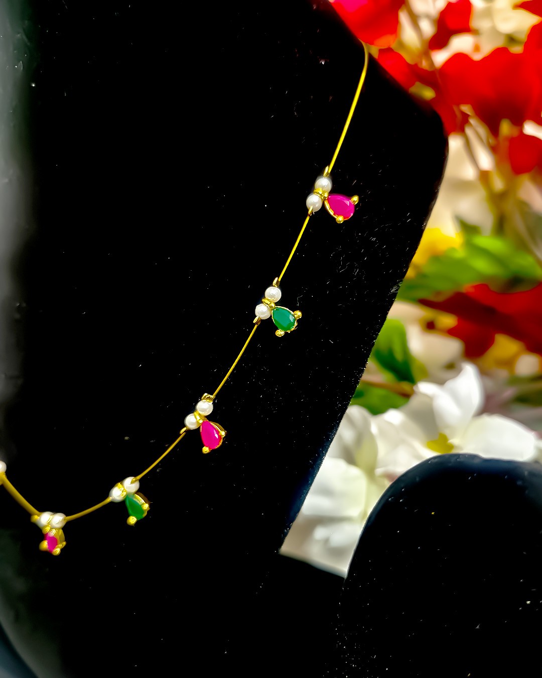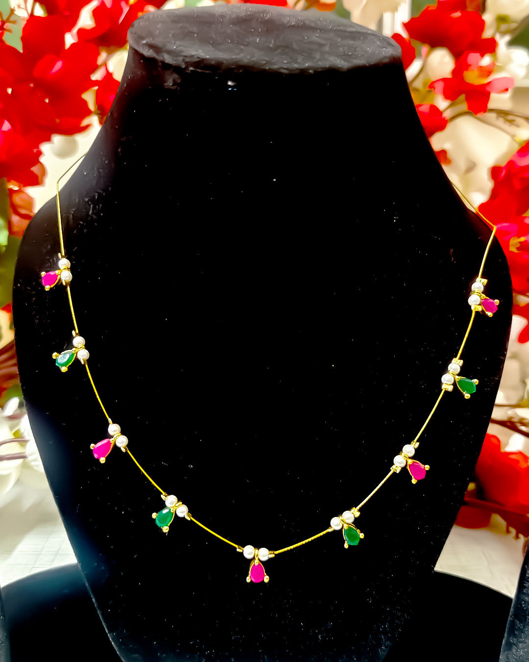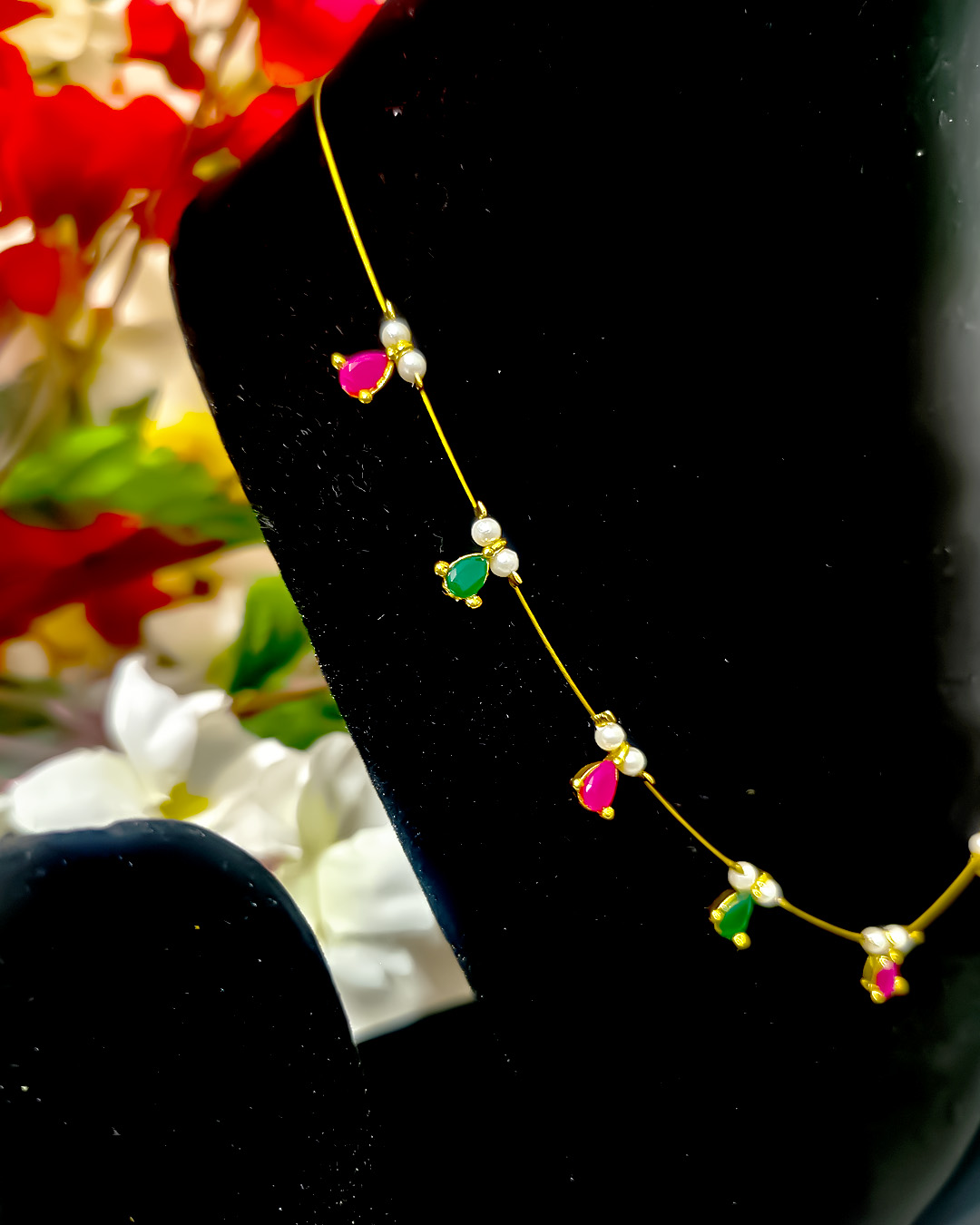 A delicate gold-toned necklace adorned with alternating green and pink stones, beautifully accented with tiny floral designs. Perfect for adding a graceful touch to both traditional and modern outfits.