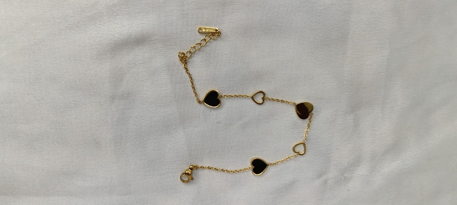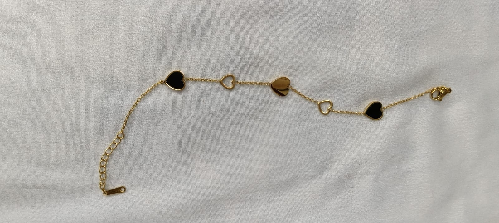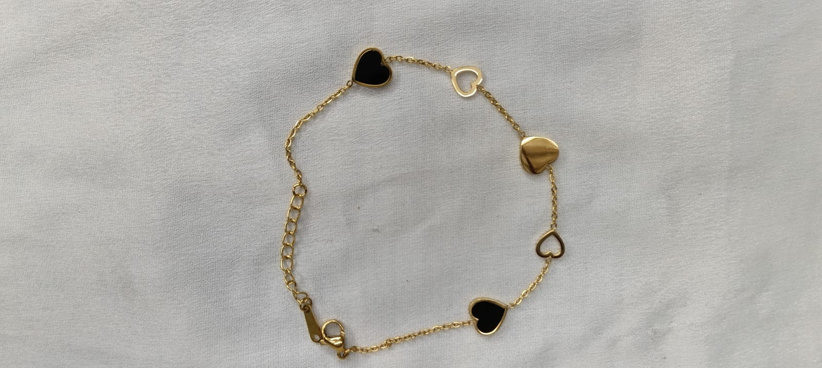 A delicate gold-tone bracelet featuring charming heart motifs in black enamel and polished gold. Designed to symbolize love and elegance, perfect for everyday wear or gifting.