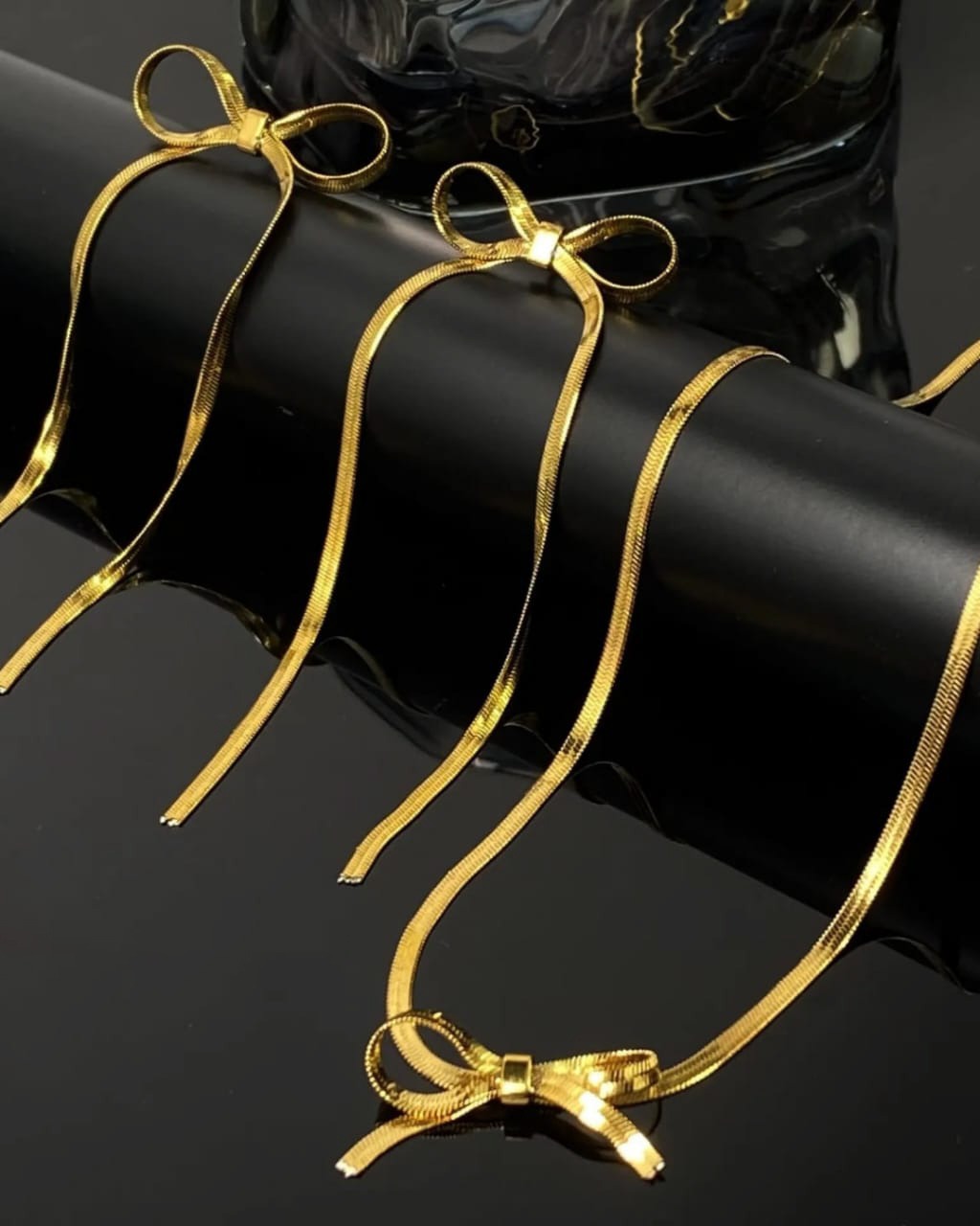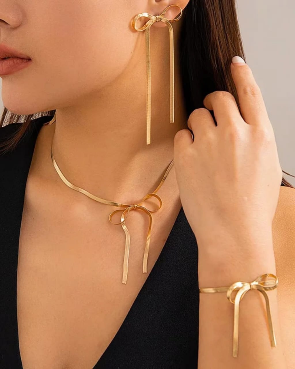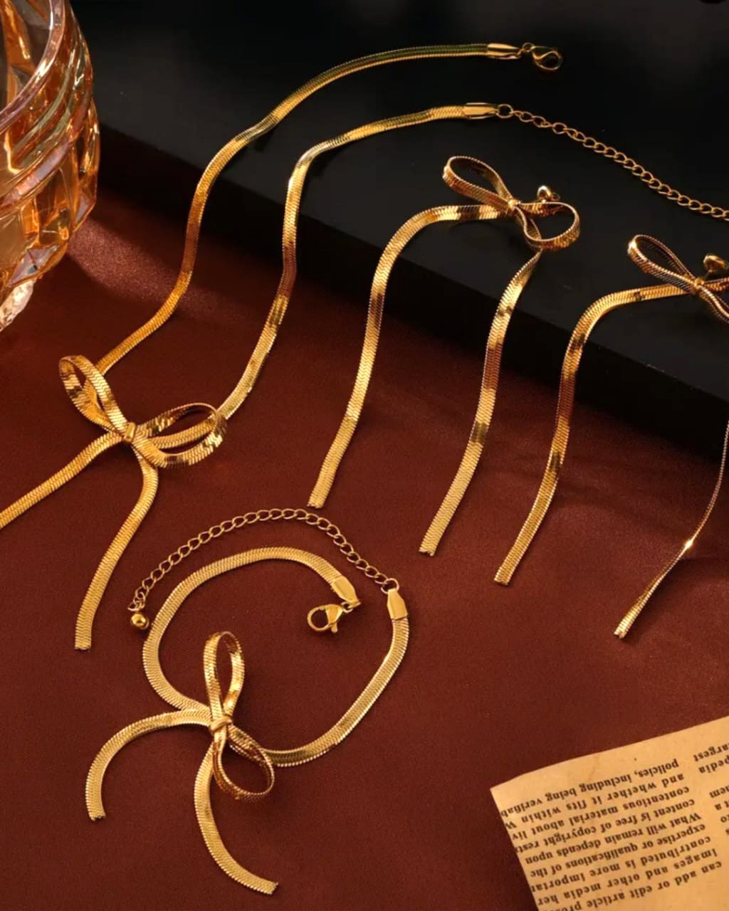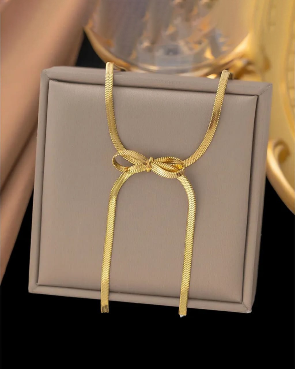 A luxurious gift hamper featuring a graceful bowknot pendant necklace and matching bracelet, crafted with sleek snake chains. This set blends charm and sophistication, perfect for special occasions or thoughtful gifting.
