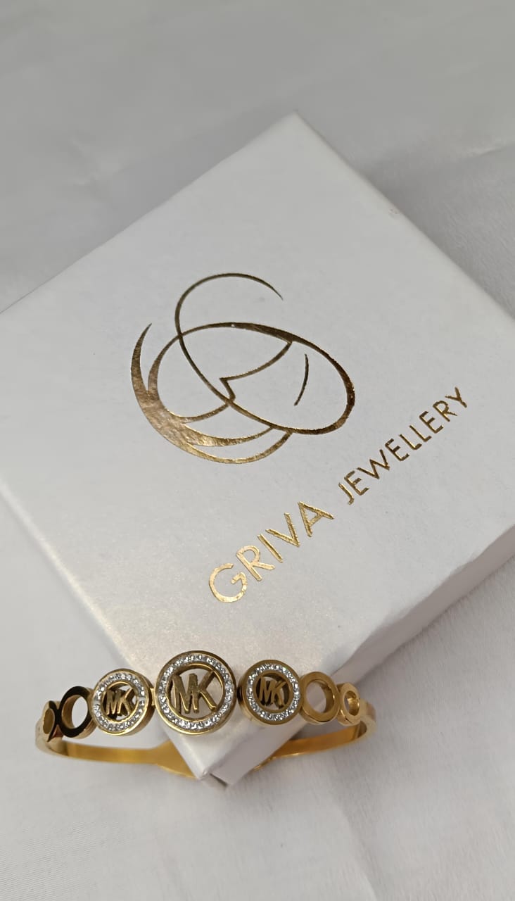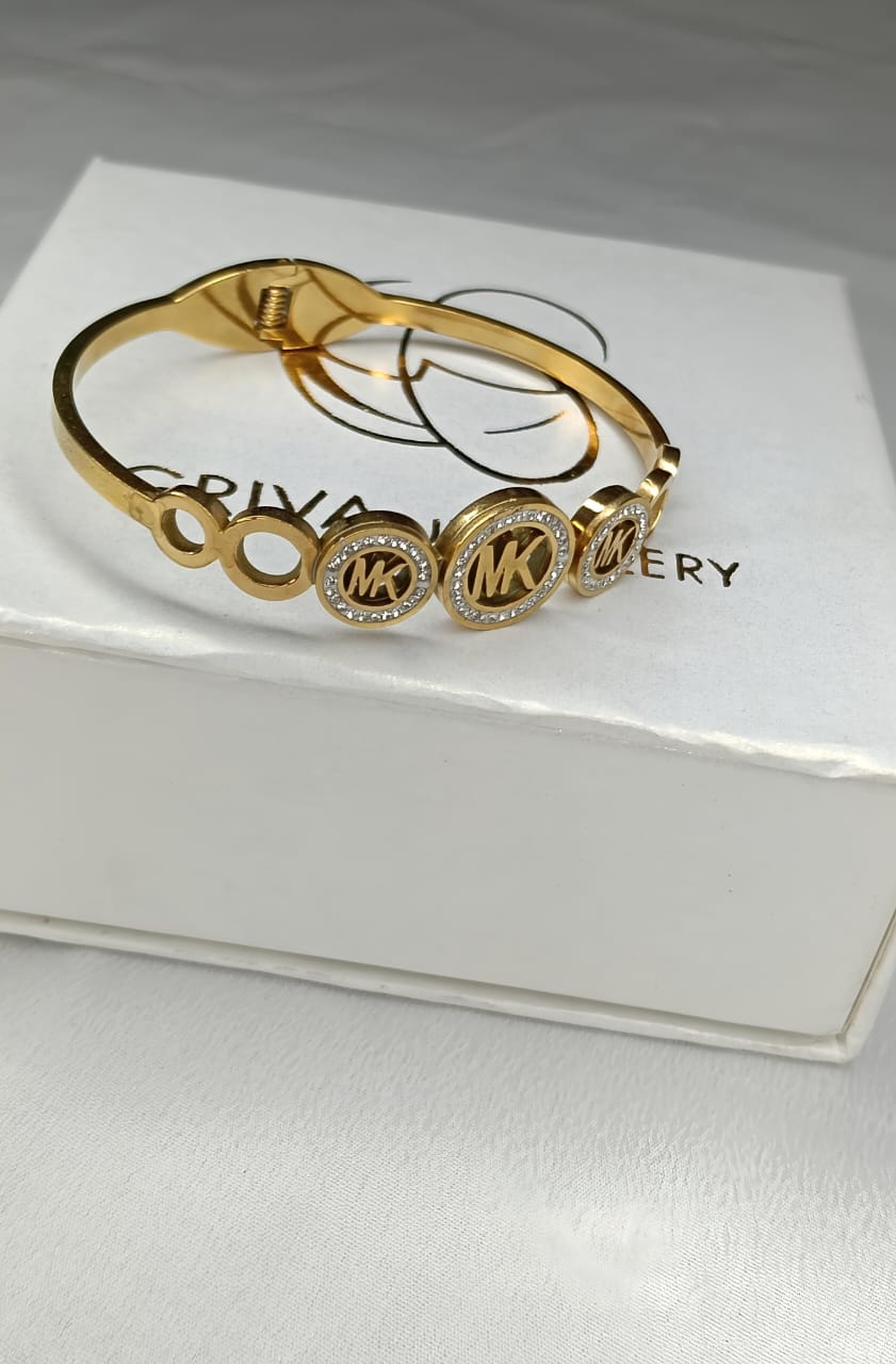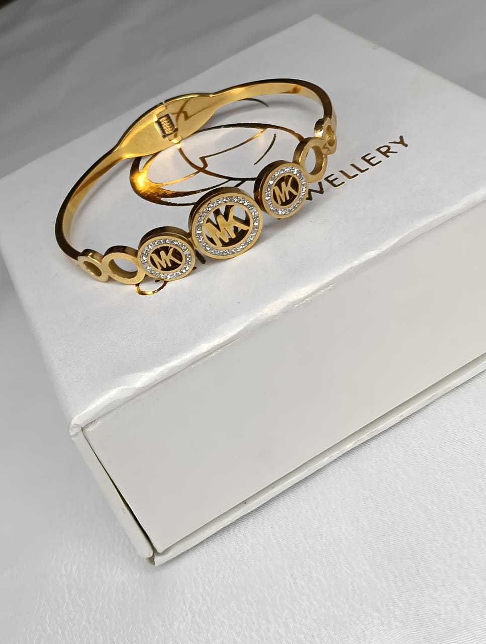 A chic designer bracelet featuring gold-toned metal with sparkling circular MK emblems. Its luxurious shine and sleek design make it a perfect accessory for both everyday wear and special occasions, adding a touch of class and sophistication to your style.