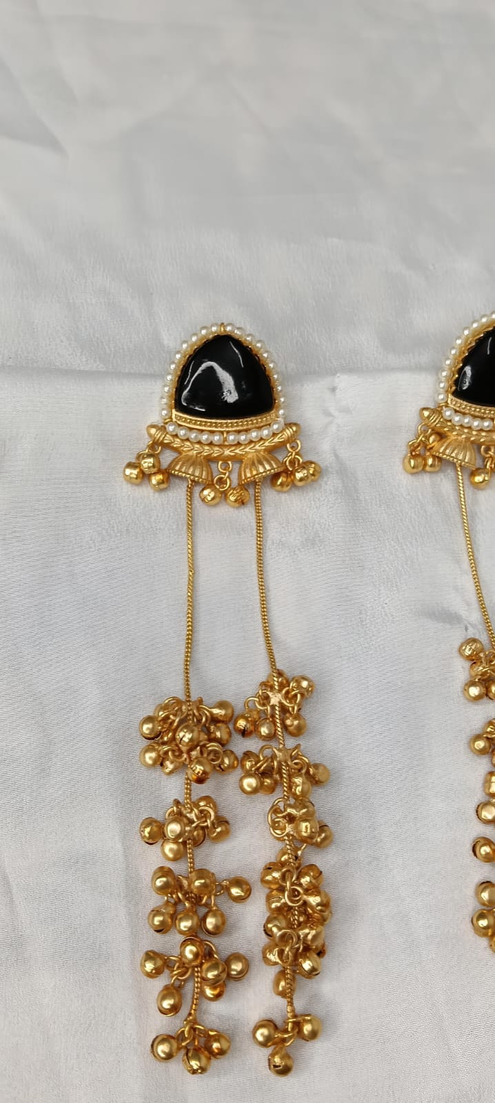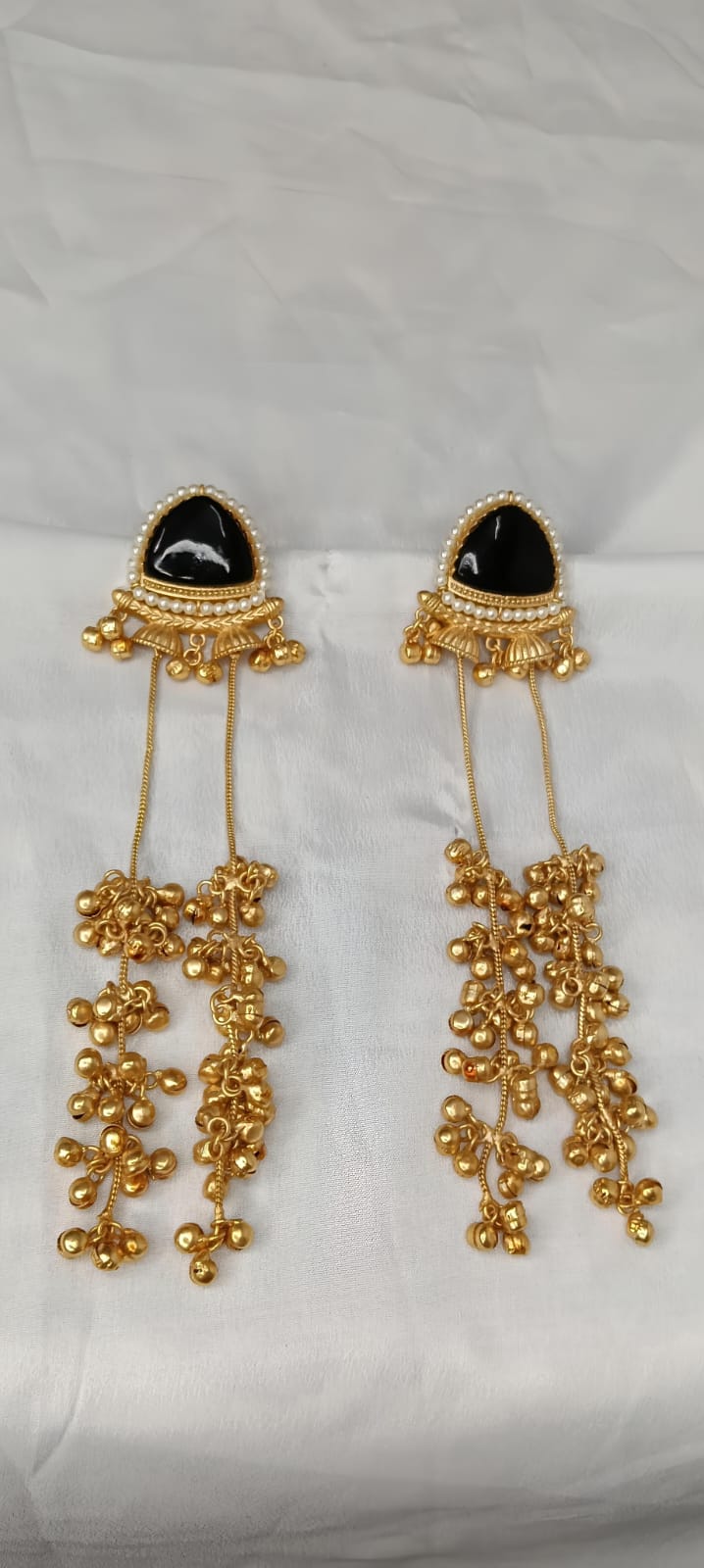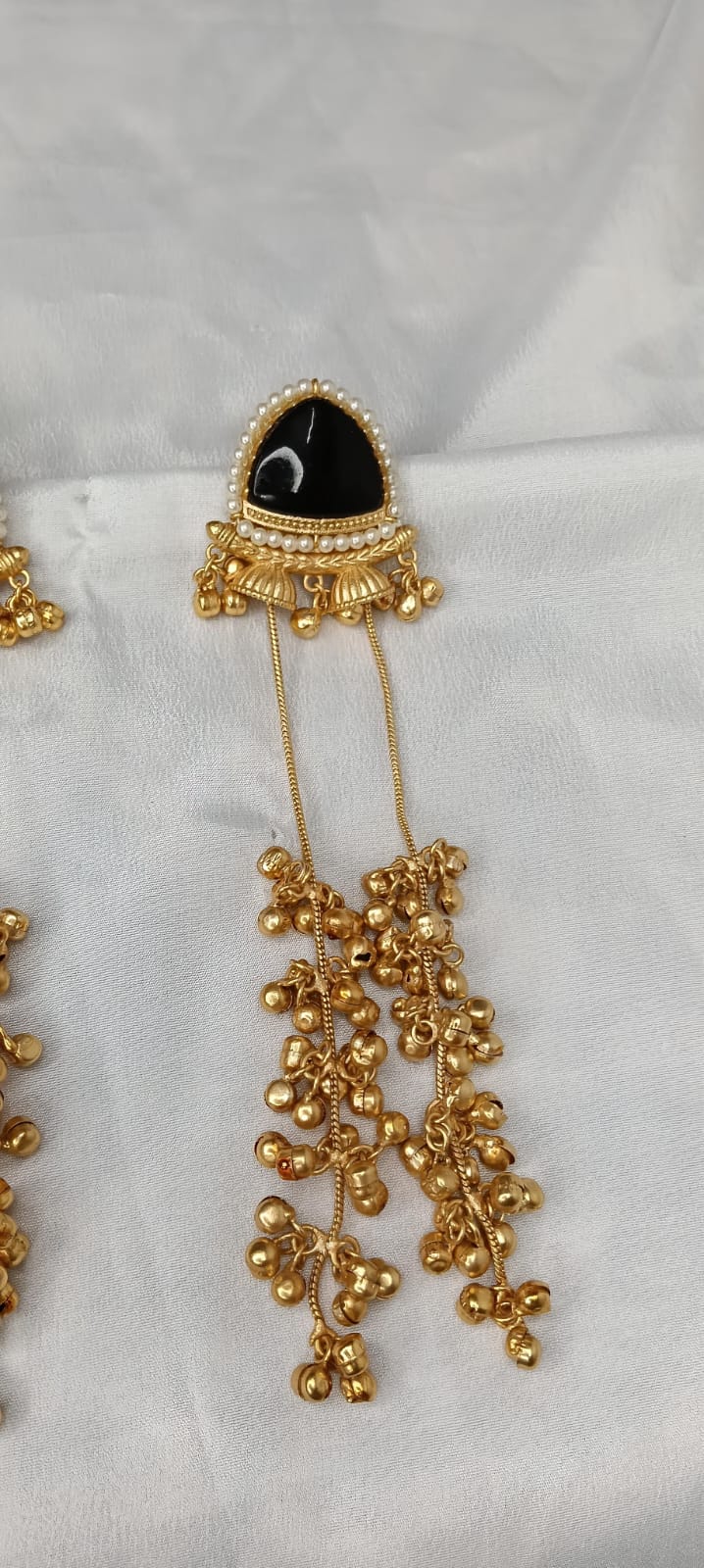 Elegant Kashmiri-style jhumkis featuring black stone tops adorned with pearl detailing and cascading golden ghungroo chains, adding a royal and traditional touch to any ethnic outfit.