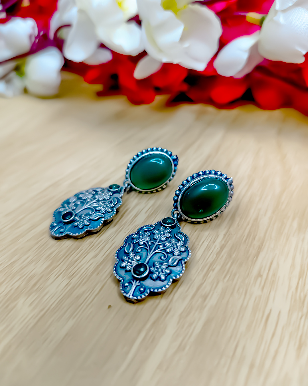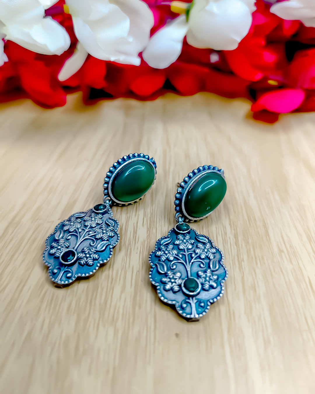 Celebrate timeless tradition with these “Jaipuri Design Earrings”, featuring intricate handcrafted patterns and a rich oxidised finish.