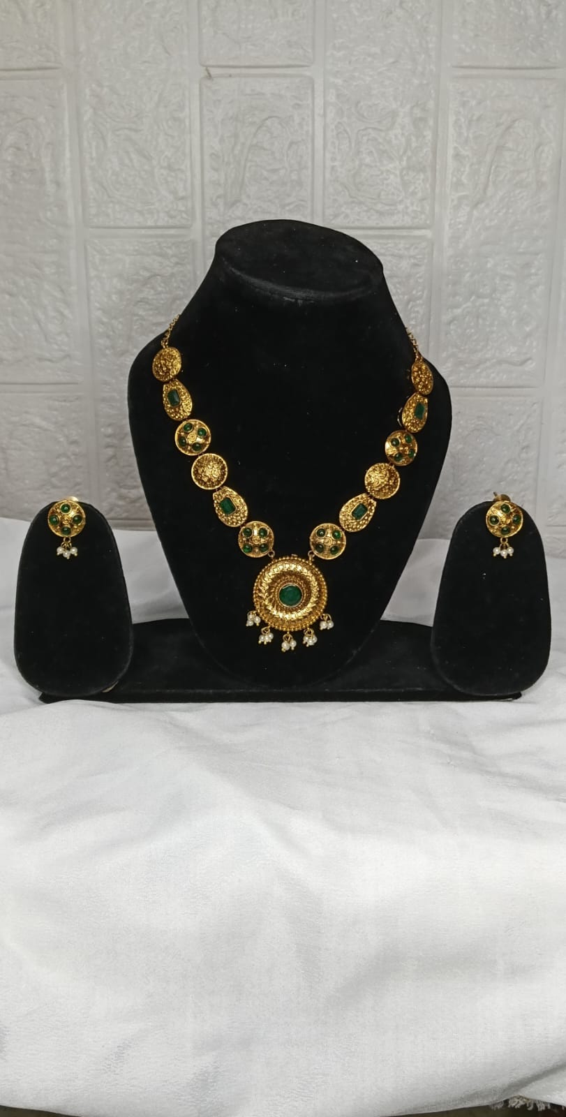 A traditional Kashmiri necklace set featuring round embossed gold-tone motifs accented with green stones. The statement circular pendant with hanging pearl droplets adds a classic ethnic charm. Comes with matching earrings for a complete festive and bridal-ready look.