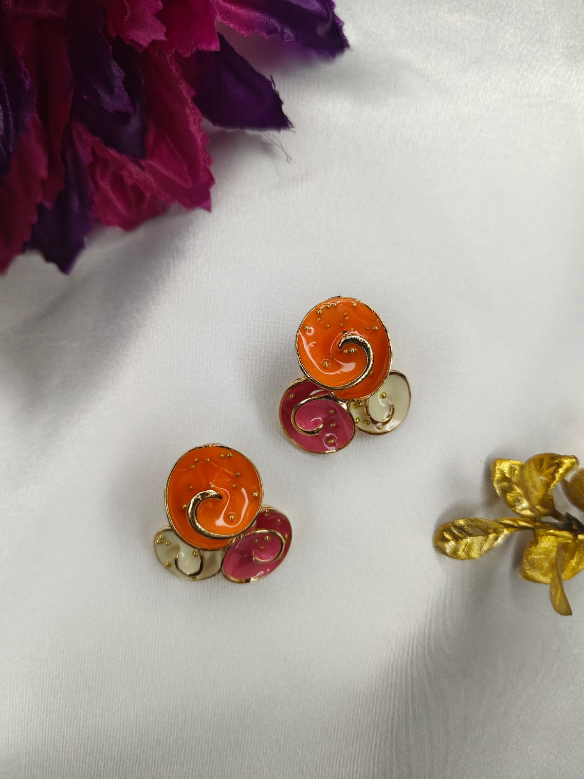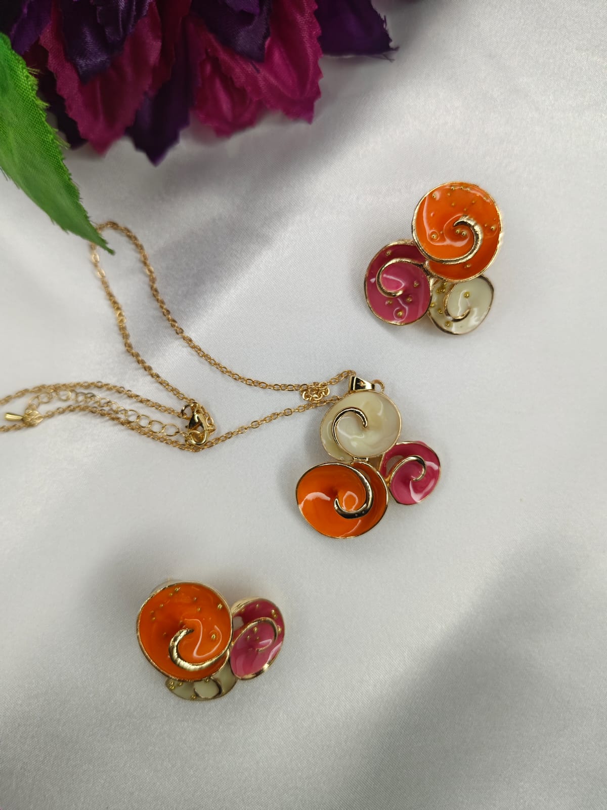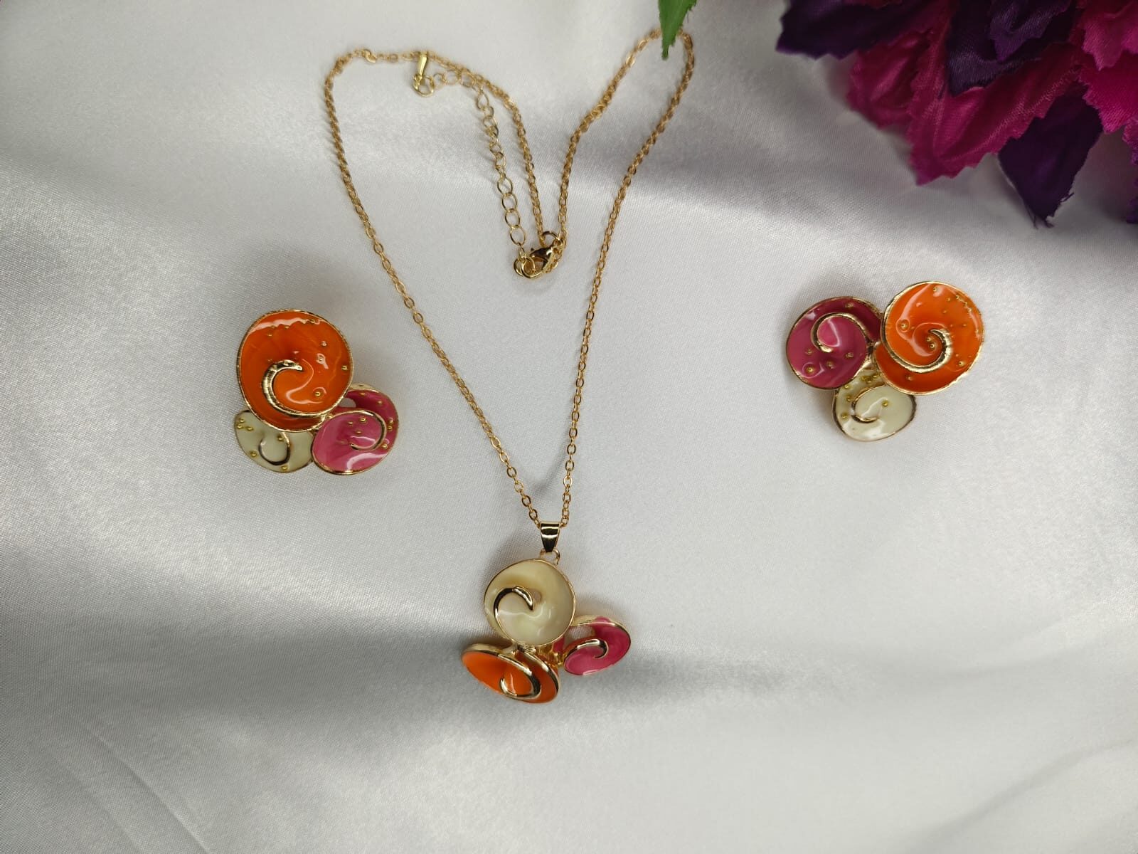 Brighten up your style with this vibrant “Kiltz Flower Pendant Set”, featuring a unique design that blends artisanal charm with colorful elegance. The playful combination of red, orange, pink, and green tones arranged in a swirl-floral motif creates a youthful and artistic vibe.