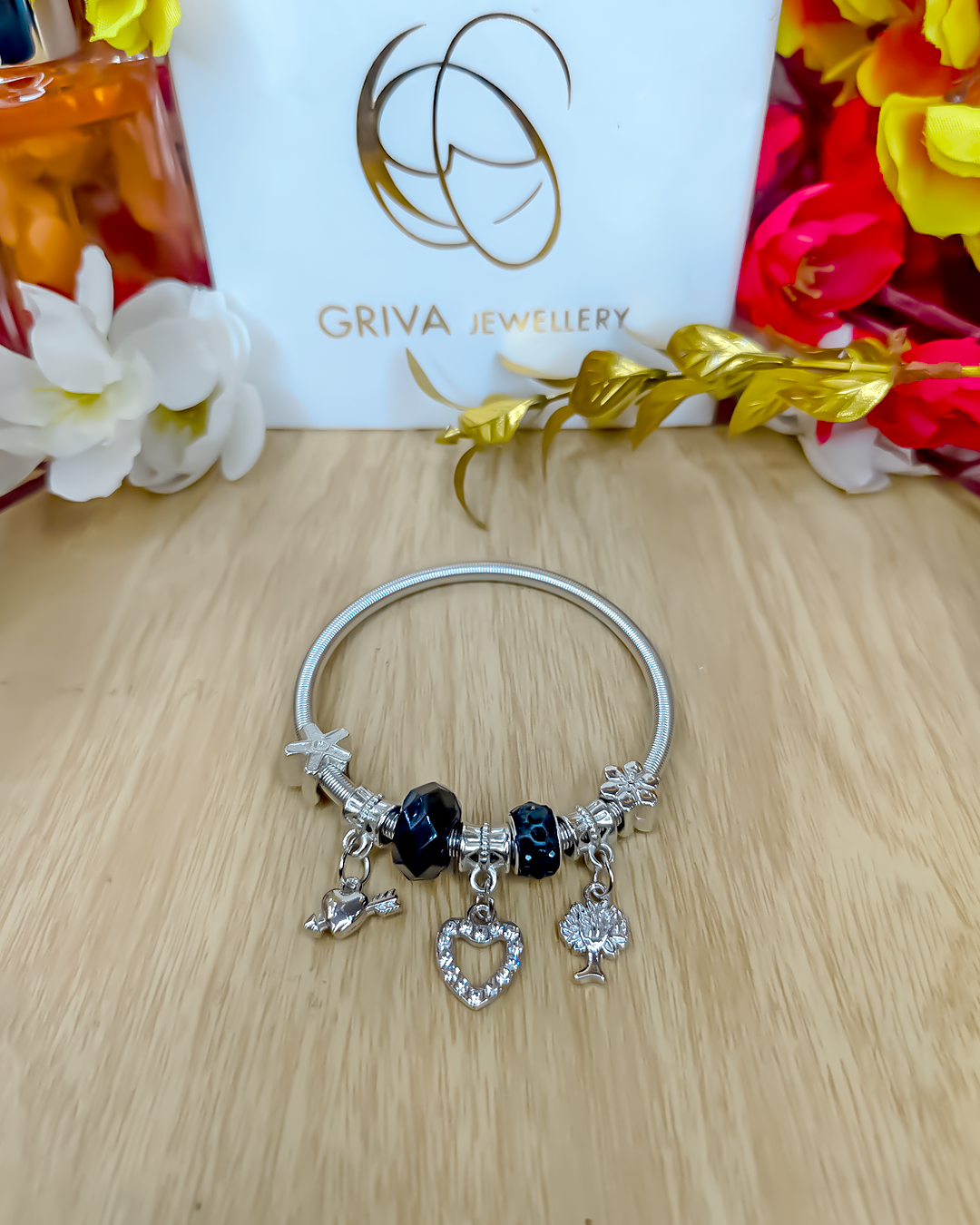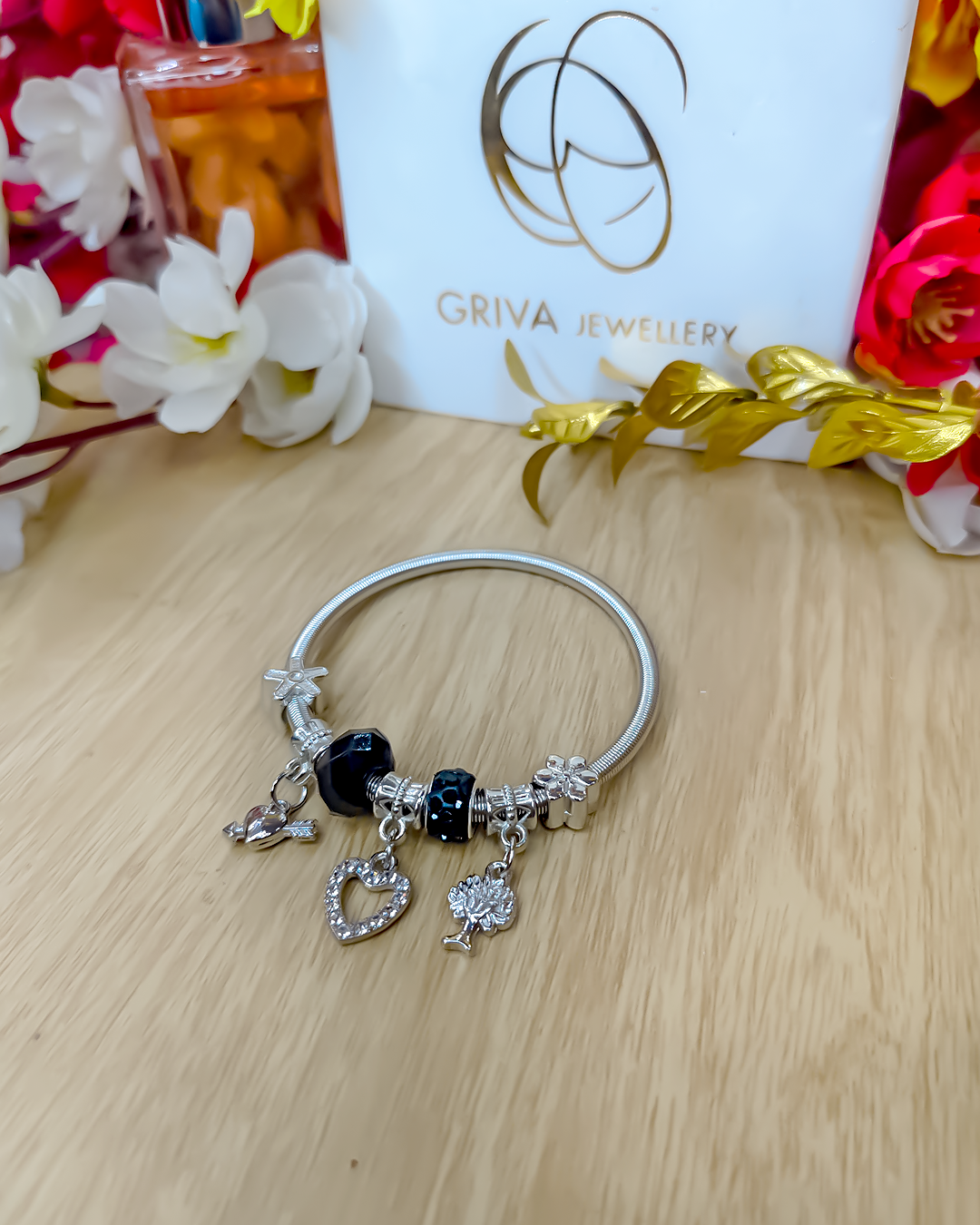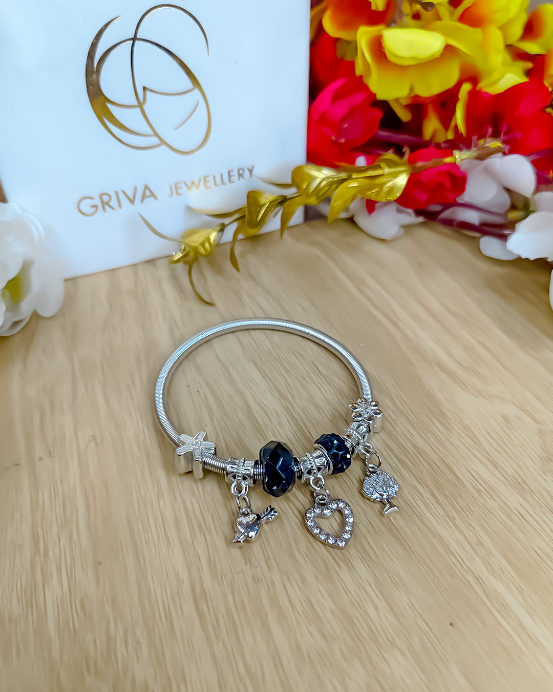 Add a touch of elegance to your look with the Midnight Charm Bracelet, featuring black bead accents and delicate hanging charms for a graceful, modern appeal.