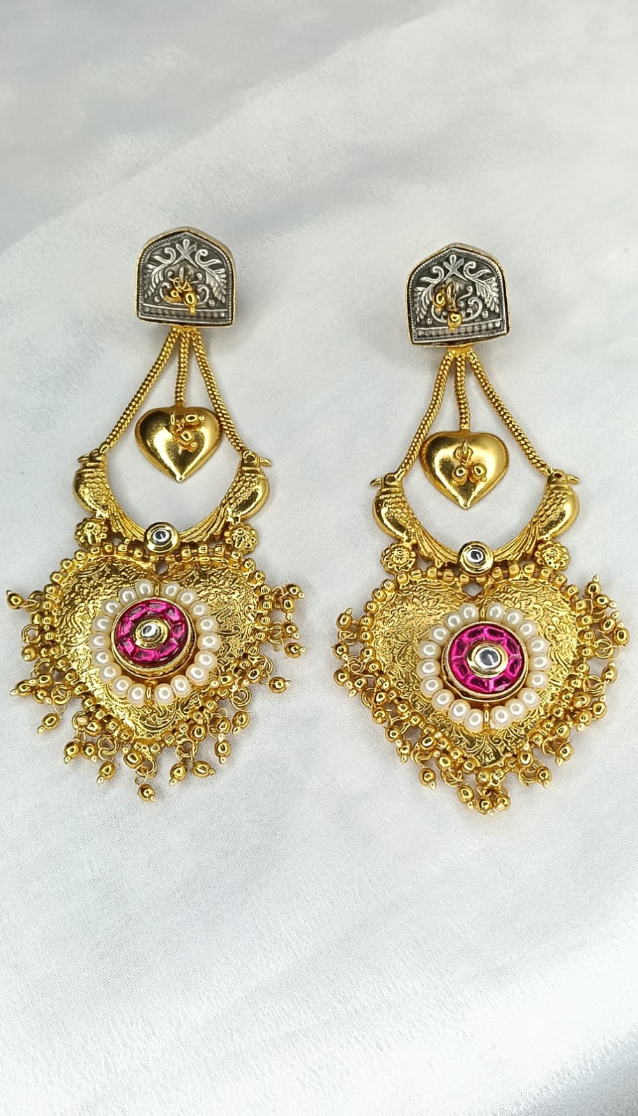 A stunning pair of Kashmiri jhumkis showcasing heart-shaped gold detailing, dual-tone artistry, and a radiant pink stone center surrounded by pearls — a perfect blend of tradition and romance.