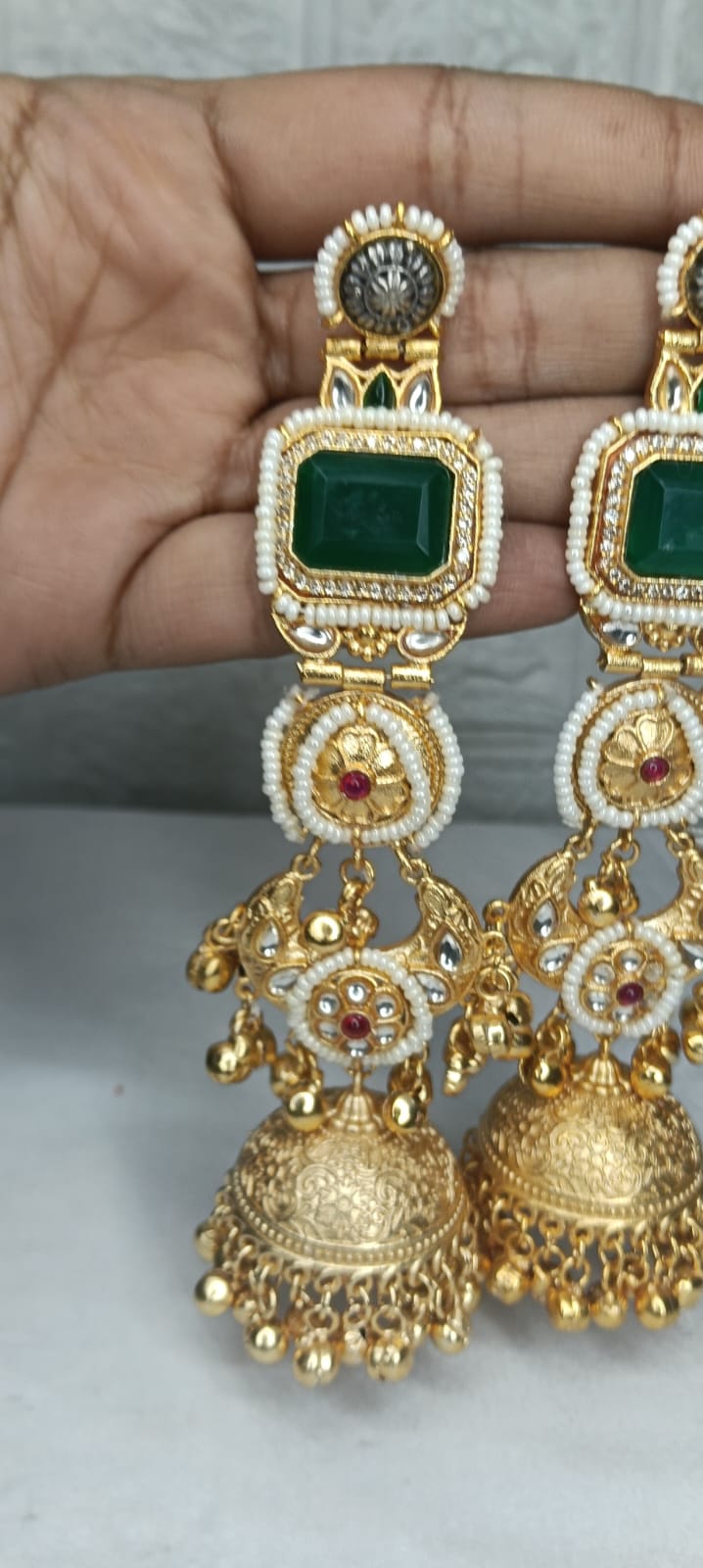 Inspired by temple and palace jewellery, this earcuff showcases green stone panels, pearl detailing, kundan accents, and heavy carved jhumka drops.