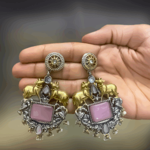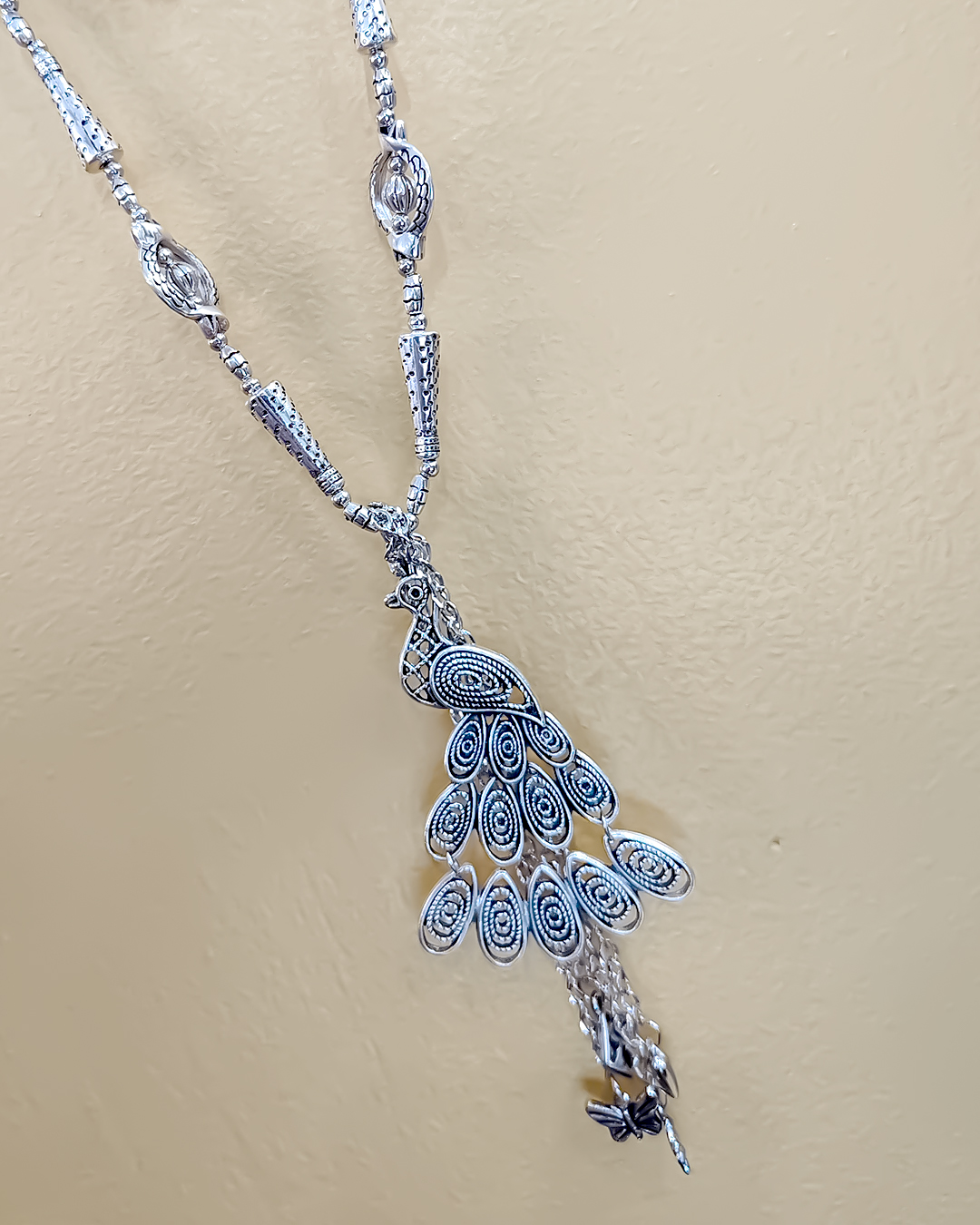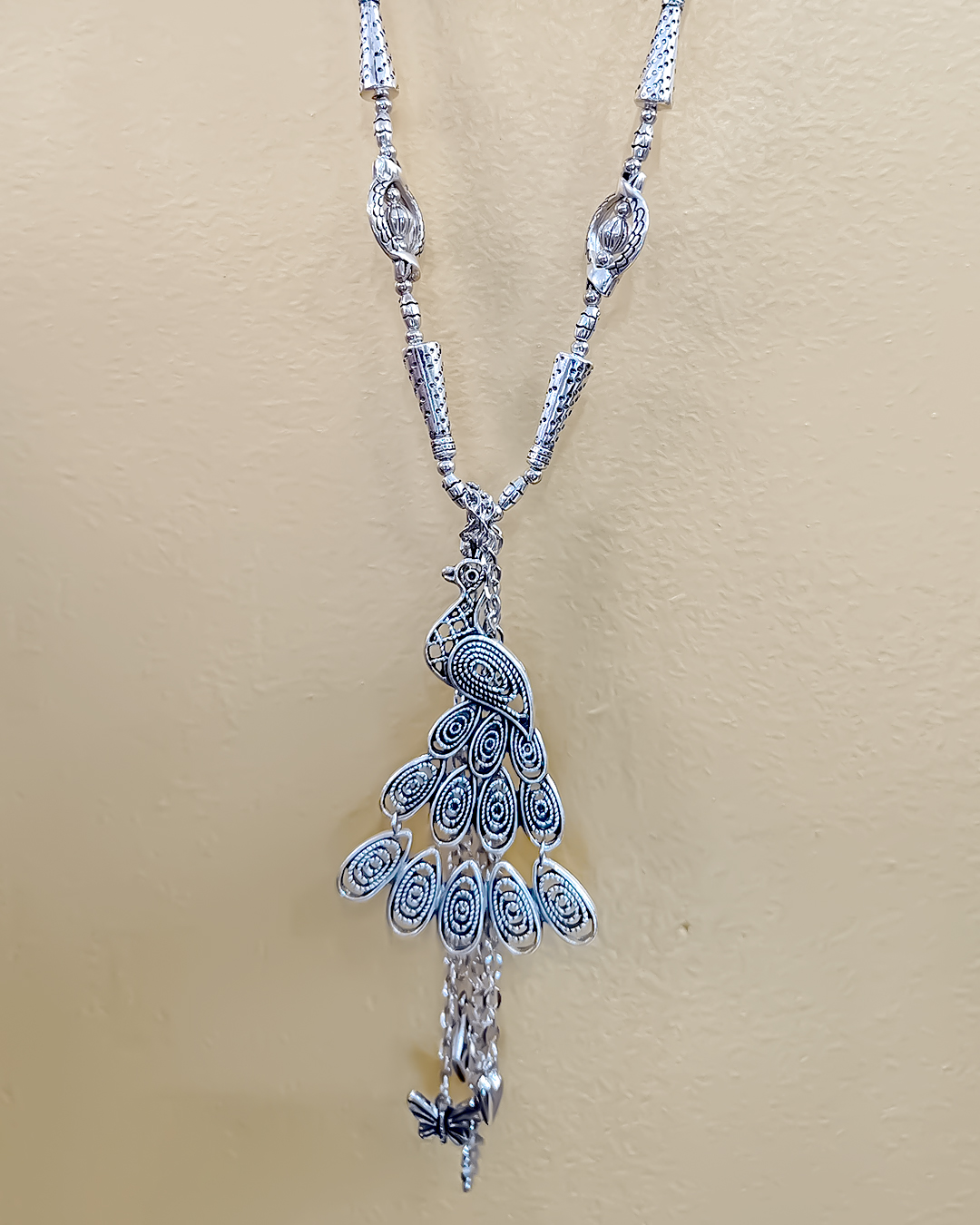 Embrace ethnic elegance with this intricately crafted Peacock Silver Oxidised Pendant. Featuring a graceful peacock motif and traditional oxidised finish, it adds a rustic charm to any outfit, making it perfect for cultural events or casual wear.