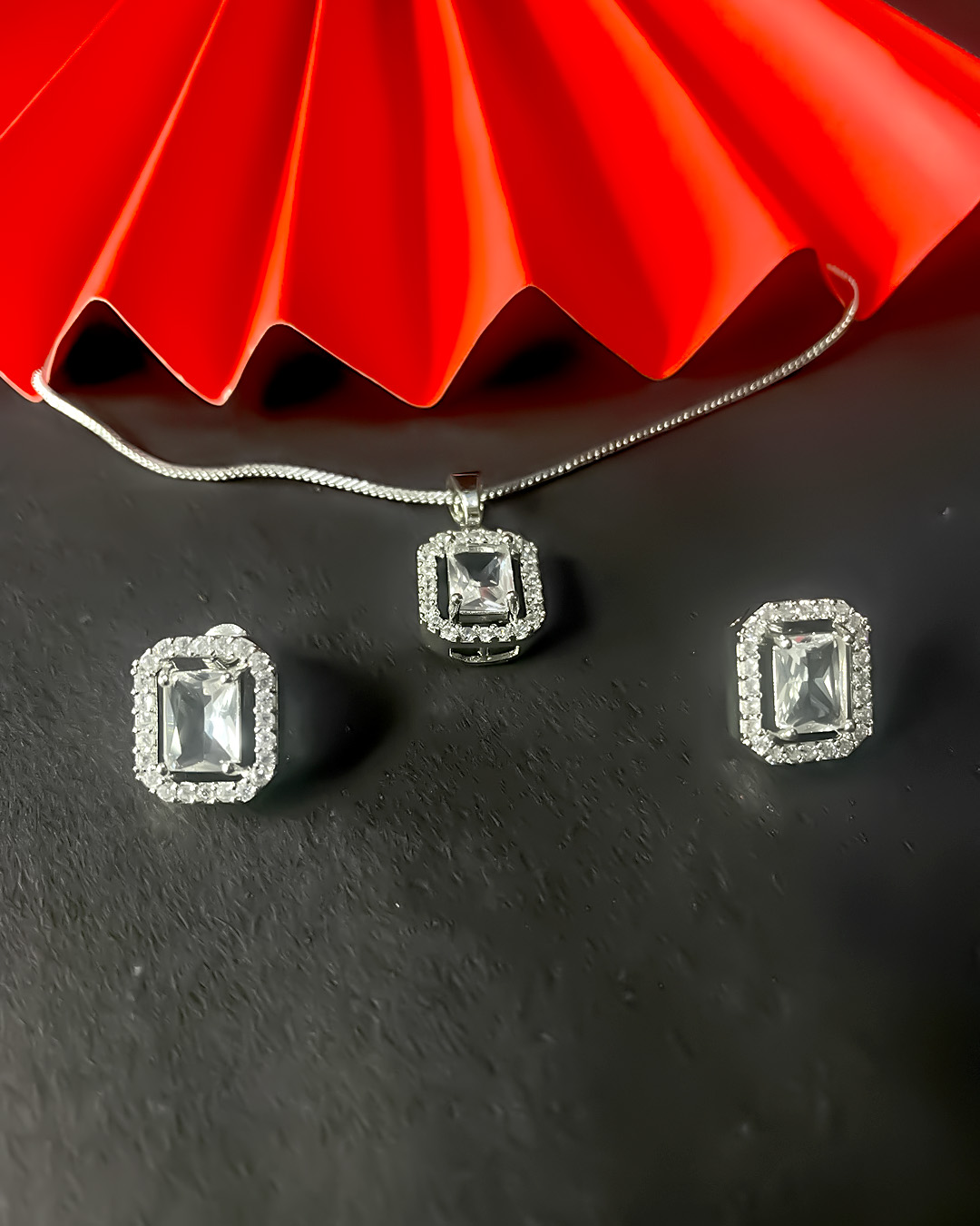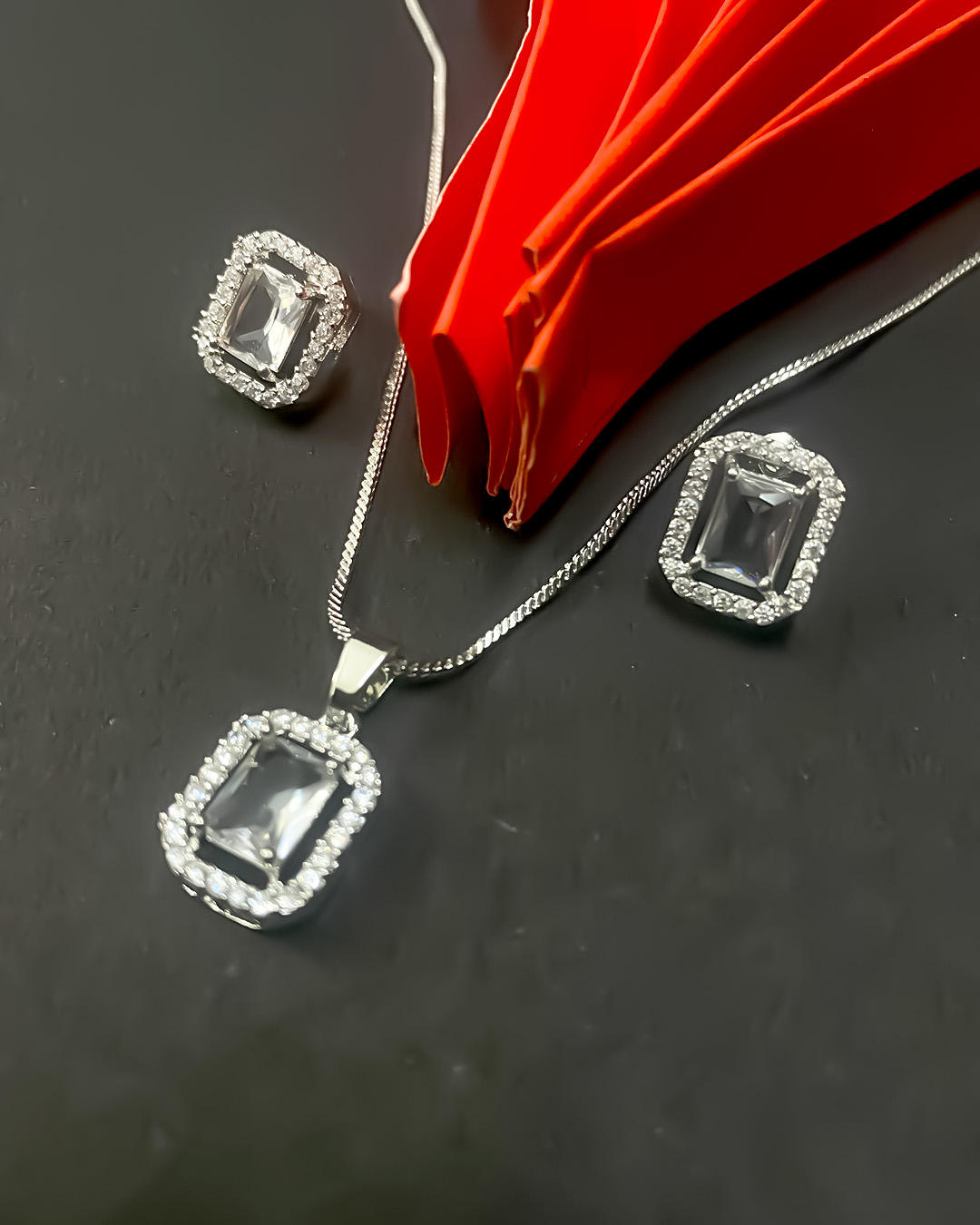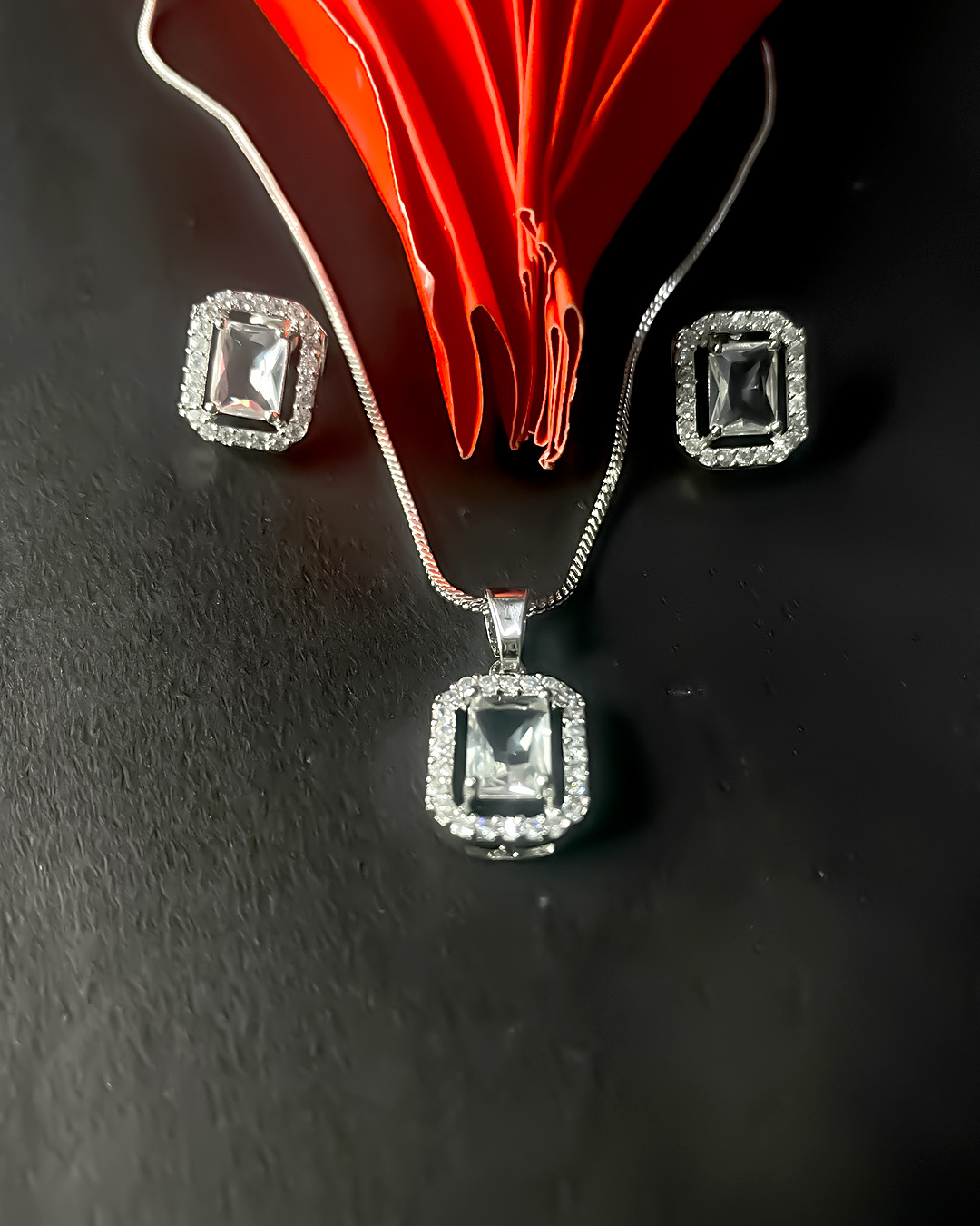 A sophisticated American Diamond set featuring a sleek rectangular pendant with a sparkling stone border, paired with matching earrings to reflect timeless beauty and modern grace.