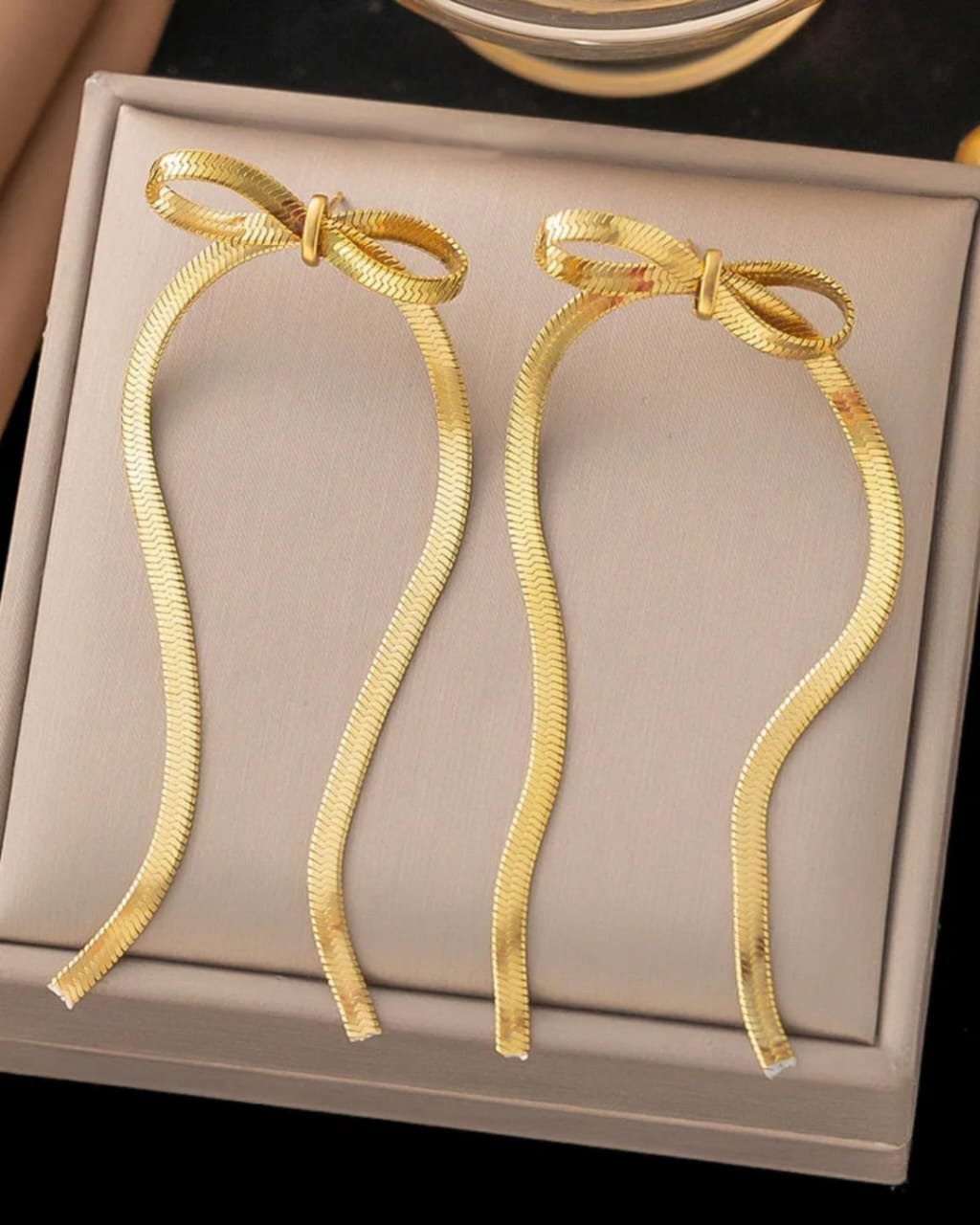 Make a graceful statement with these gold-toned bowknot earrings featuring sleek snake chains. Their minimalist yet chic design adds elegance to any outfit, perfect for parties, formal events, or everyday glam.