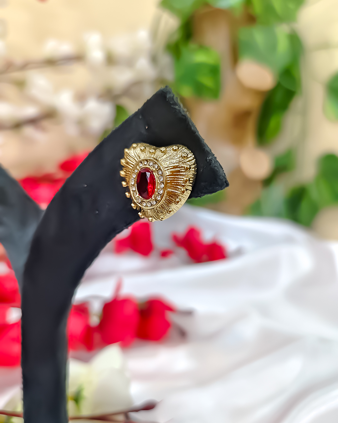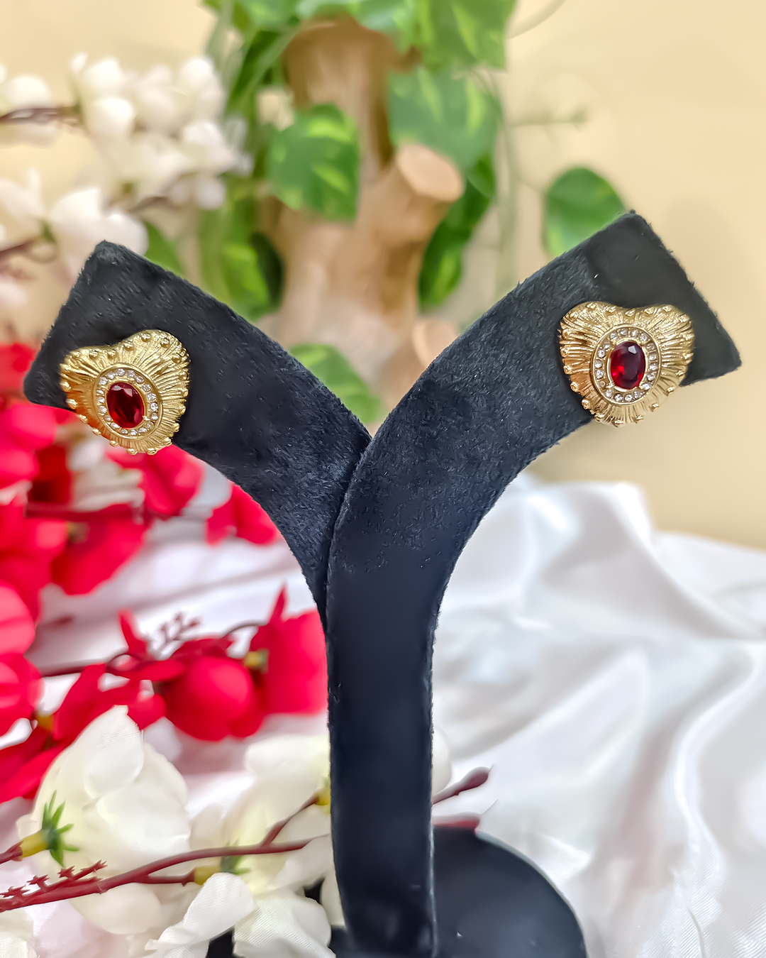 Add a regal touch to your ensemble with these exquisite “Royal Heart Stud Earrings”. Crafted in a luxurious heart-shaped design, each earring features a striking ruby-red stone at the center, surrounded by intricate gold-toned detailing and delicate embellishments that sparkle with elegance. Perfect for both everyday glam and special occasions, these studs bring timeless charm and sophistication to any look.