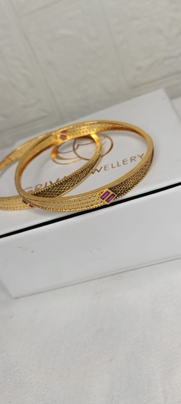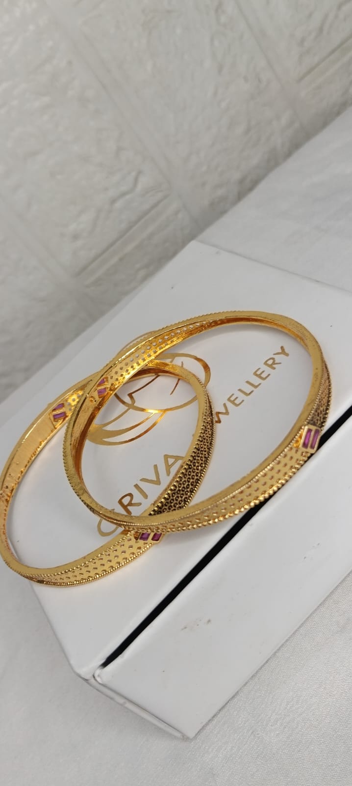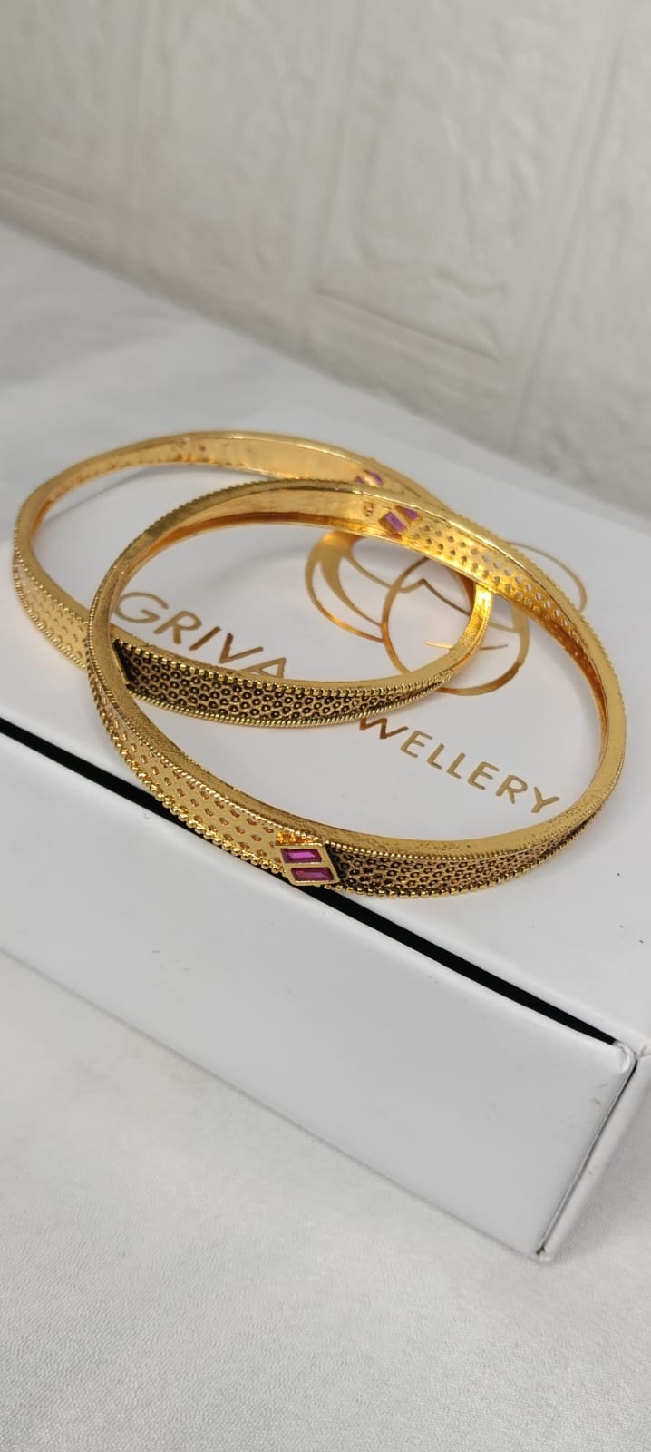 A pair of elegant gold-tone bangles featuring delicate textured detailing and subtle ruby-colored stone accents. Their sleek and minimal design makes them perfect for both everyday wear and festive occasions. 💫